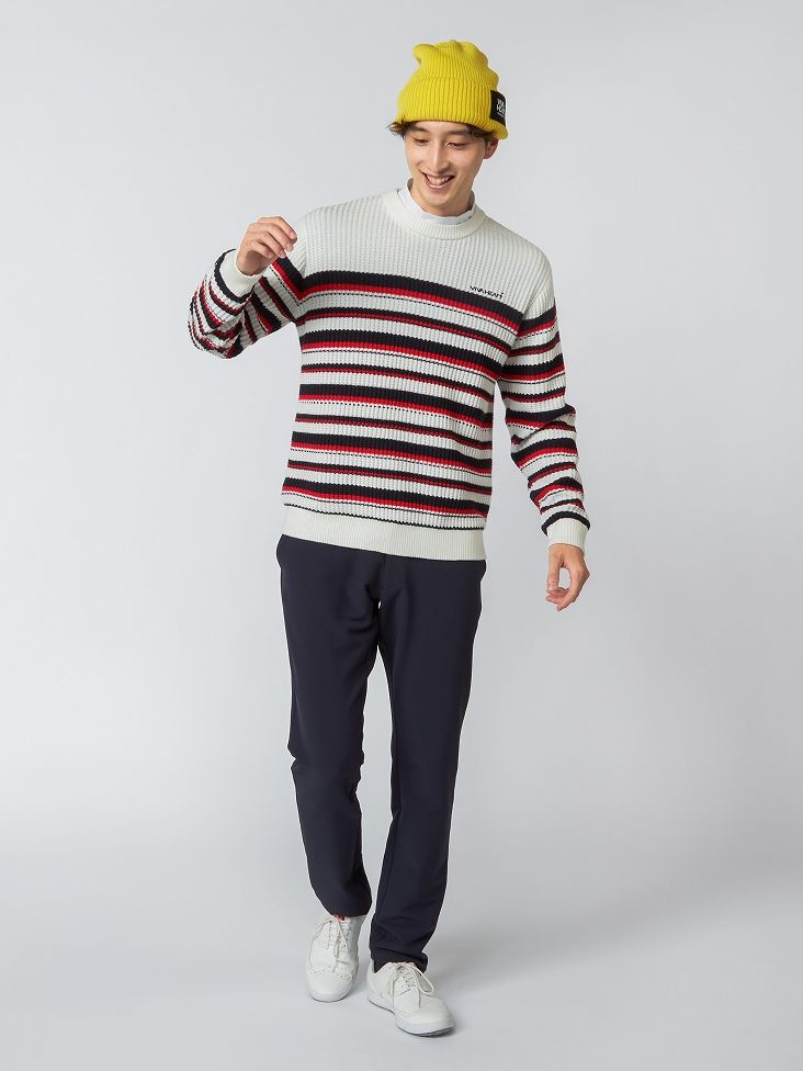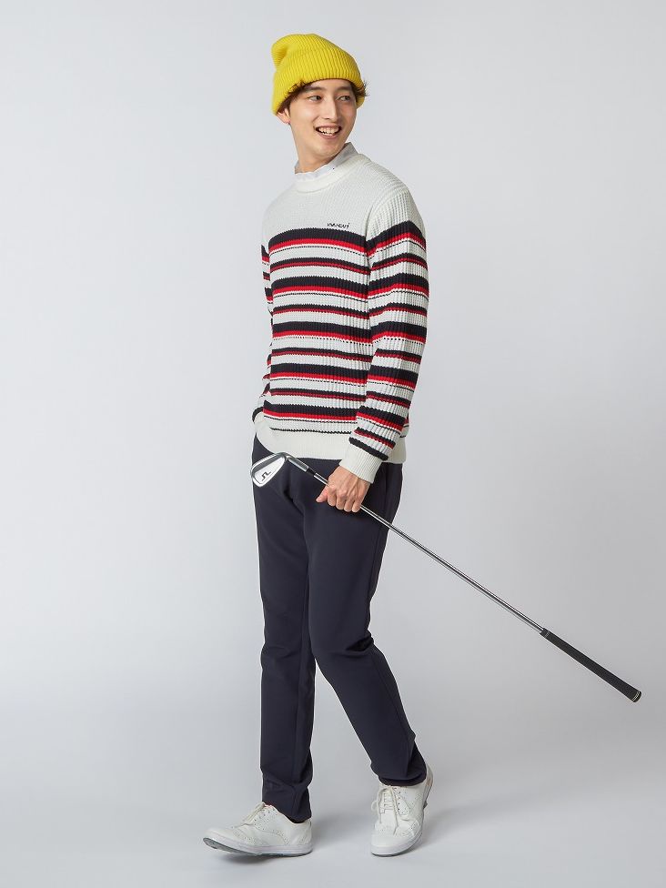 ワッフル組織で見た目にも軽やかなファンクションを感じるマルチボーダーニットと撥水4WAYパンツの冬スタイリング。冬場のラウンド中の風による底冷えを軽減するためにストレッチタフタで総裏仕様にしています。寒さ対策も万全に冬のラウンドも楽しんで頂けるスタイリングの提案です。