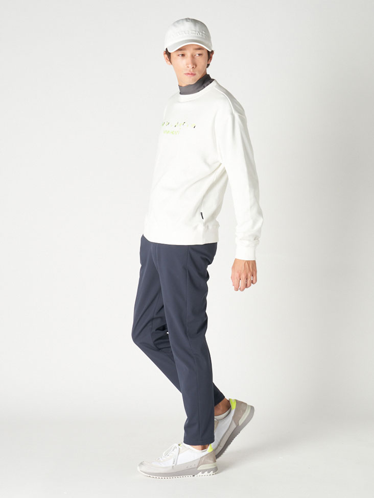 暗くなりがちな秋冬にあえてホワイトを強調したコーディネート。夏っぽくなりすぎないようインナーはチャコール・パンツはネイビーと落ち着いた色味に。スウェットはると抜群のとろみのある気持ち良さで常に包まれている感覚に。ゴルフでも、普段にでもお使い頂けるアイテムです。