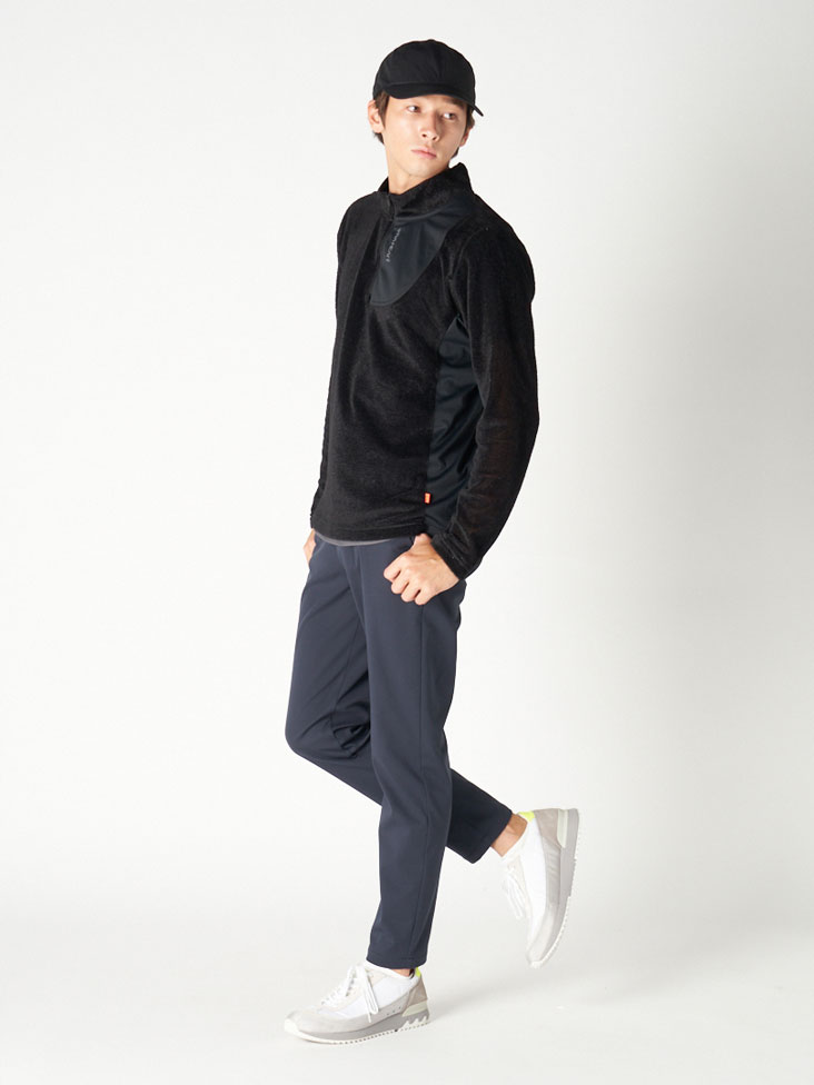 暖かいのにムレない!機能重視のゴルファー向けのオススメスタイリング。ハーフジップのトップスは、軽量感・吸汗速乾性・遮熱性を持つ多機能繊維の「Octa」を使用。あったかトップスを着たいけど、汗ばんでしまうのが嫌という方にオススメのアイテム。パンツは撥水機能がついており、急な悪天候時にも味方になってくれます。