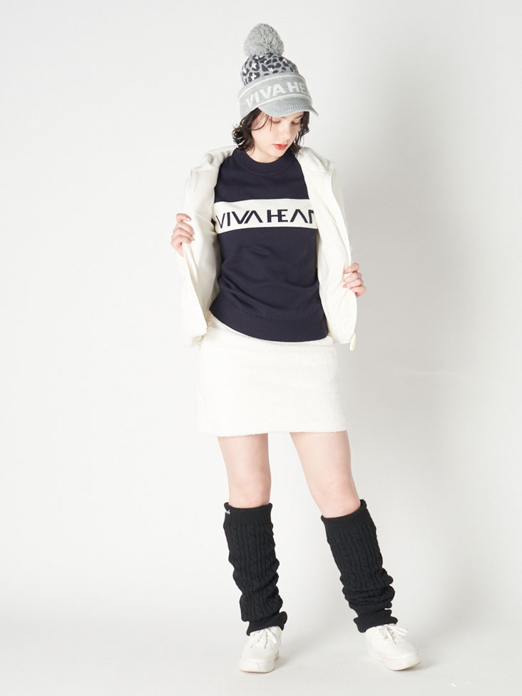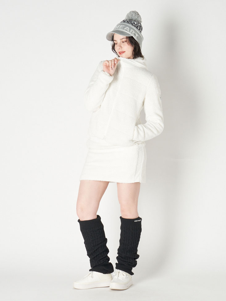 もちもちとした肌触りのロゴニットに、中綿ブルゾンを羽織った冬おすすめスタイリング。スカートもブルゾン同様の素材で、腰とお腹周りをストレッチ性に優れたタフタ素材にすることで着ぶくれしません。レオパード柄のニットキャップでアクセントをつけるのもオススメ。