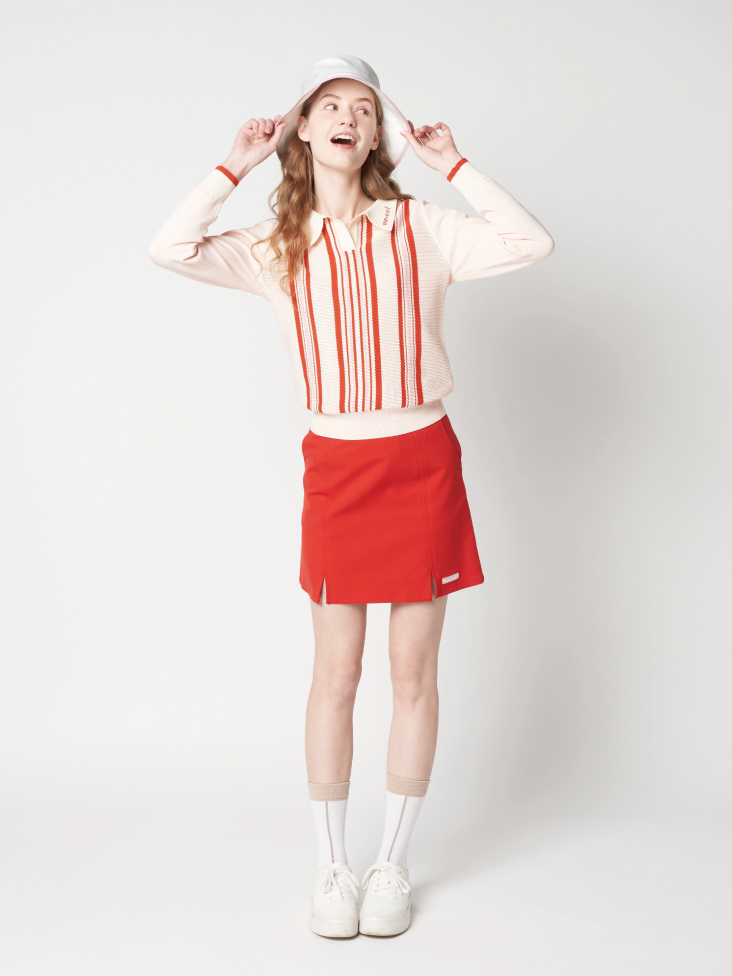 アンティークソファから着想を得たマルチストライプ柄が特徴の襟付きニットトップスはシンプルなスリットスカートと合わせてプレッピーなムードに。ピンクベースのマルチカラーが明るくかわいらしい印象に。