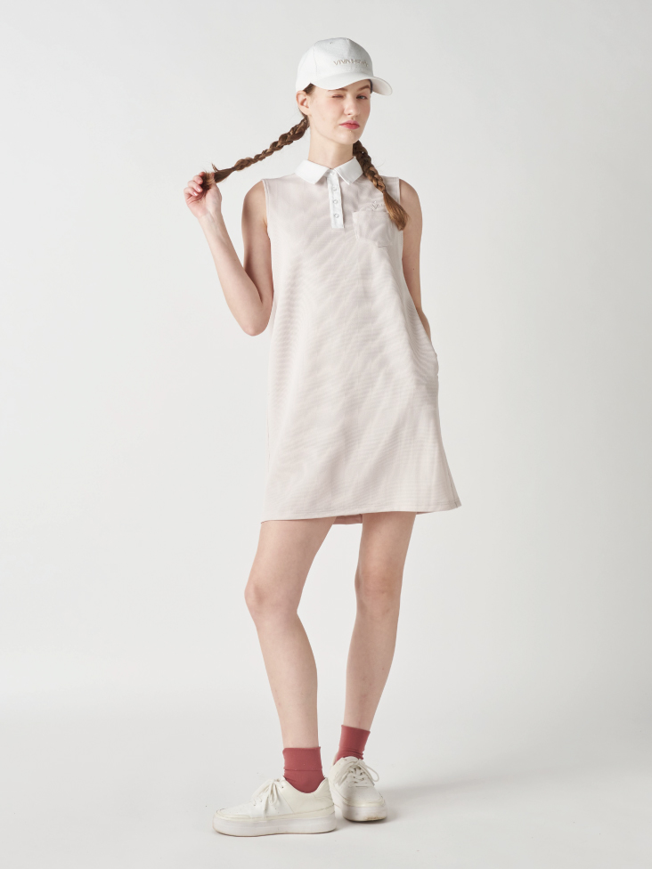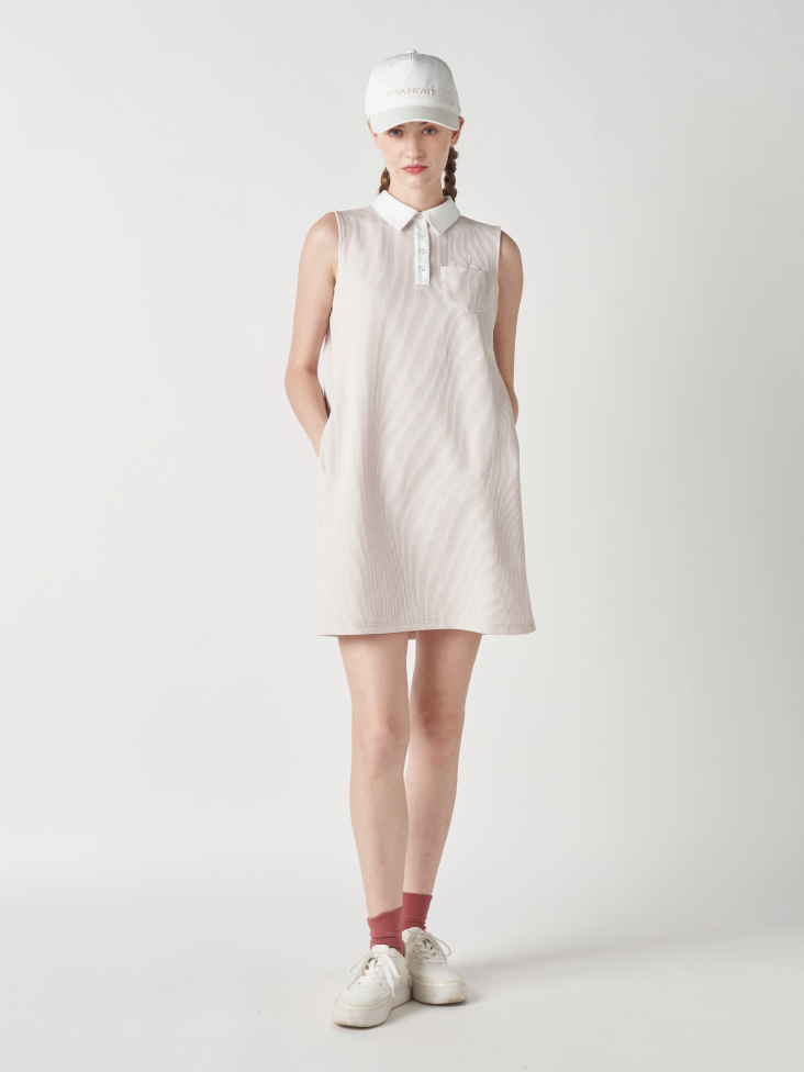 VIVA HEARTのアイコンキャラクター「ハートアイ」が胸ポケットから覗く、遊び心あるデザイン。襟付きのストンとしたAラインで大人なワンピーススタイル。背中にタックが入っており、腰回りのカバーと動きやすさを兼ね備えたアイテムです。