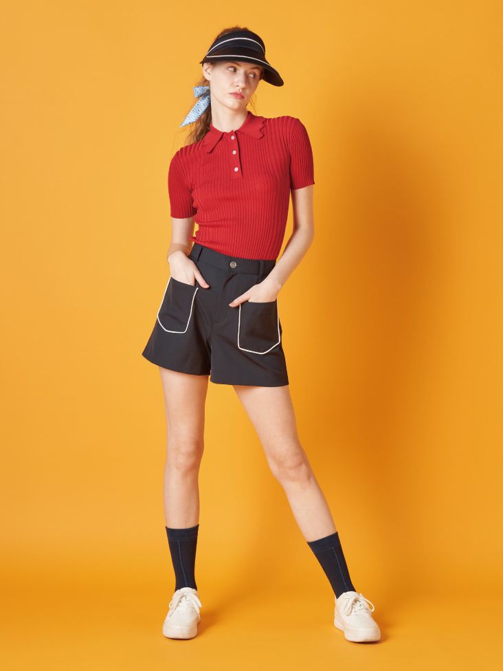 衿と裾がスカラップになった真っ赤なリブニット。衿の形が綺麗で、立体形状なので小顔効果も。フロントポケットを配した万能ショートパンツと合わせてコンパクトでキュートなスタイリングがおすすめです。