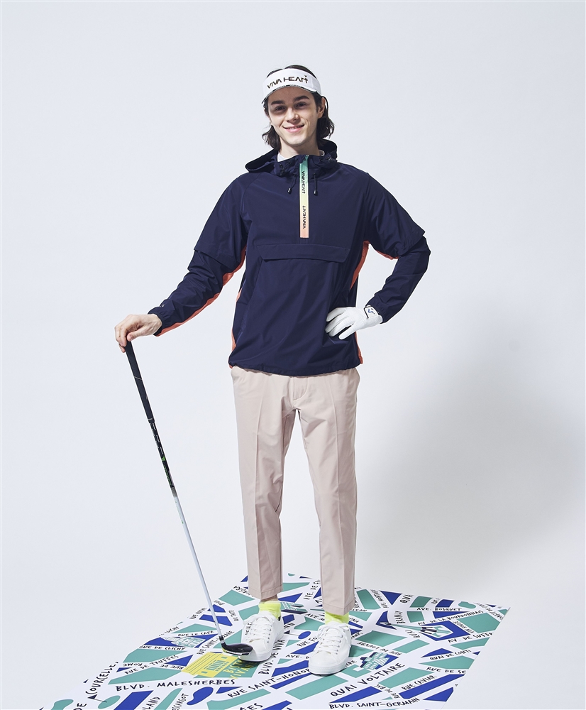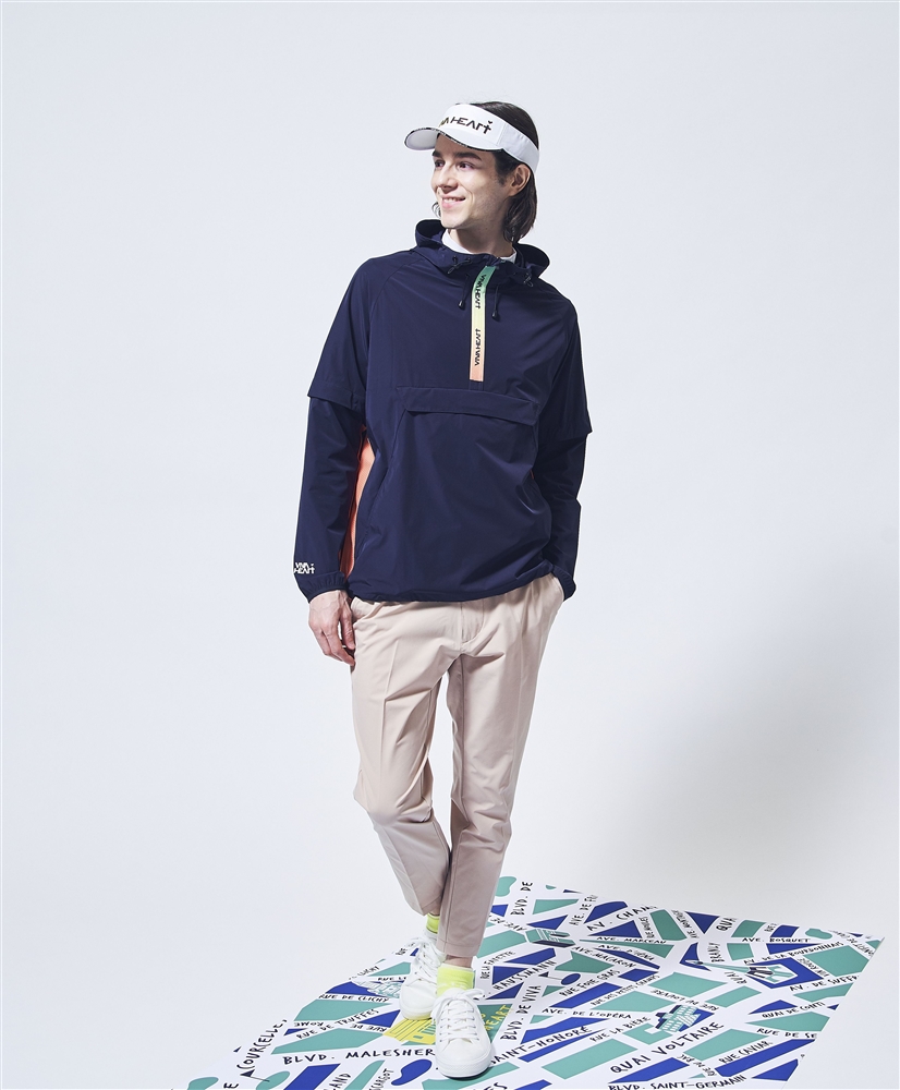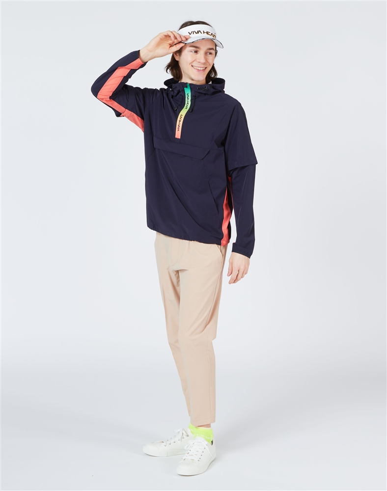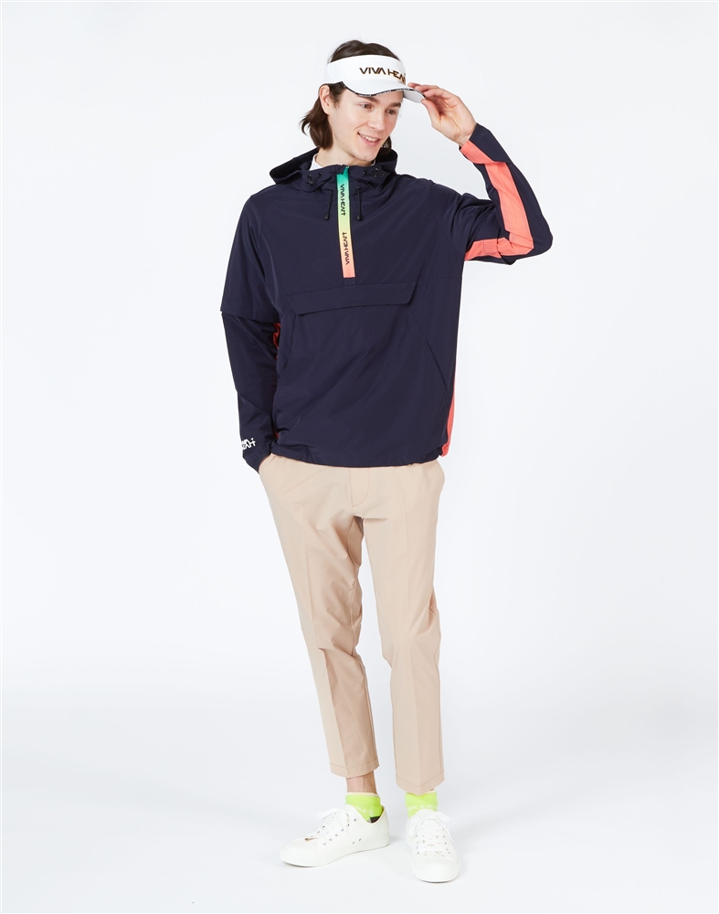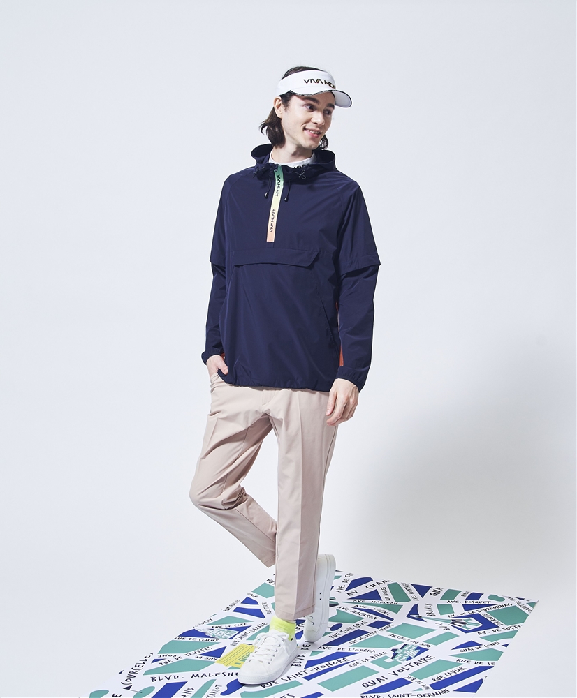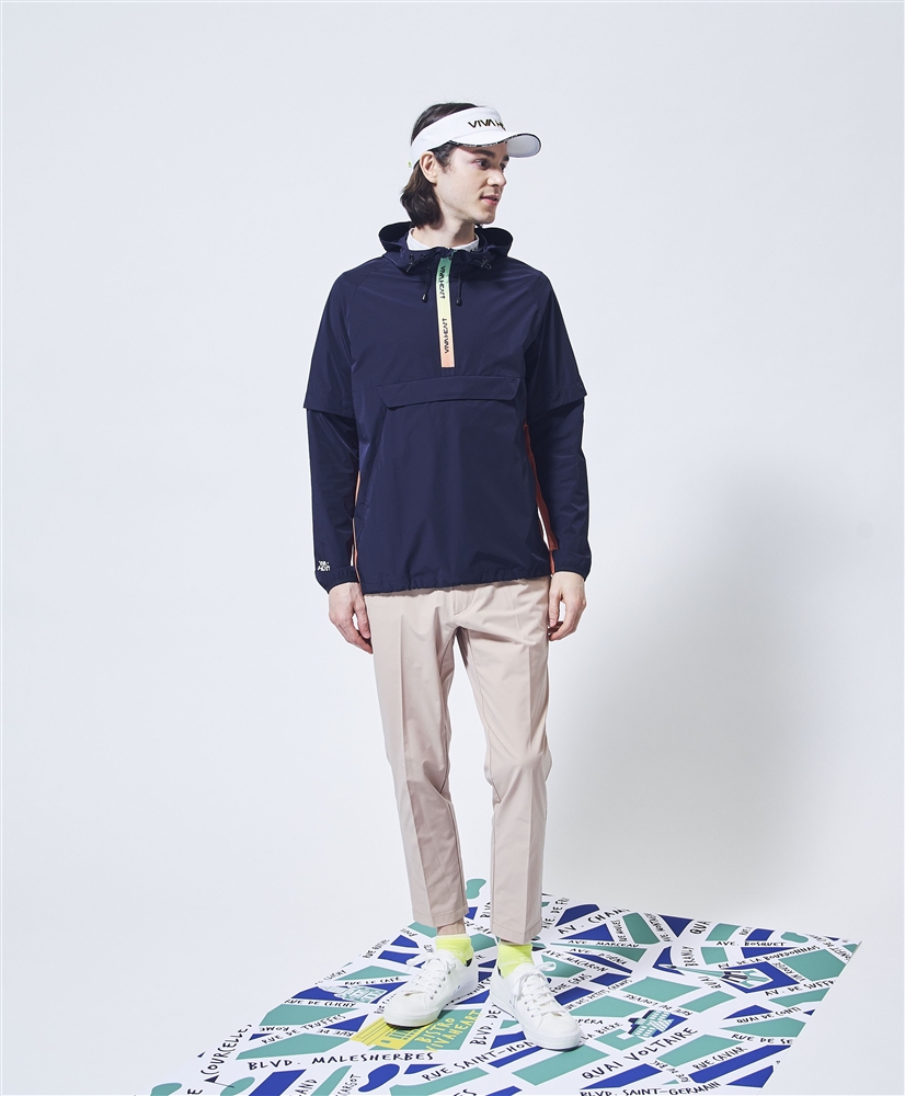 軽くてストレッチ性も抜群で撥水機能もあるアノラックパーカーで軽快にラウンドして頂けるスタイリングです。気温の変化や体温調節の為に袖は取り外し可能な設計。脇から袖下にかけてはメッシュ素材を使用し通気性も抜群です。ファスナー部分は鮮やかなレインボーカラーでアイキャッチさを表現しているのもポイントです。