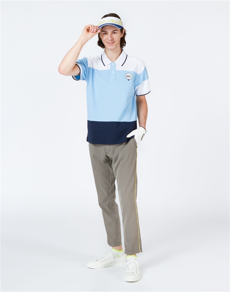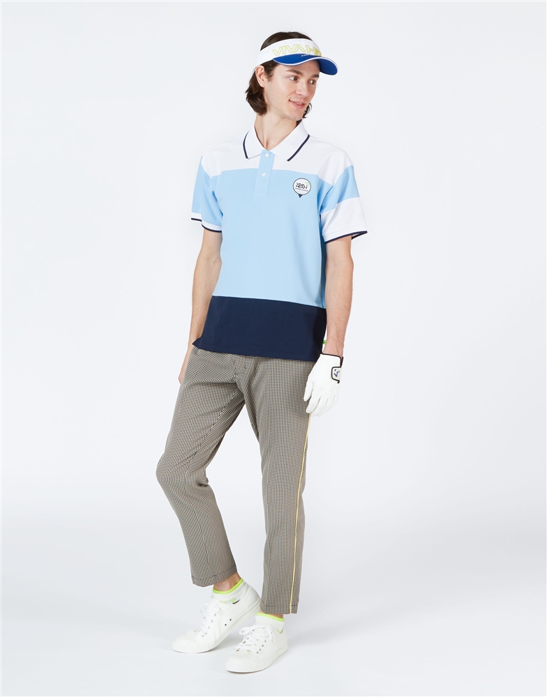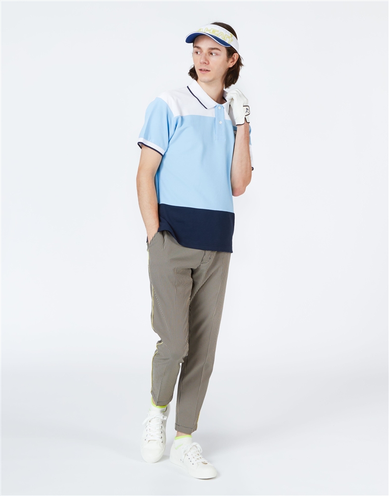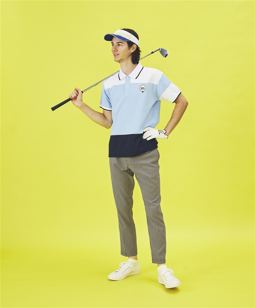 大胆にカラーブロックを施したポロシャツは通常よりもリラックスフィットのシルエットで、衣服が身体から離れることにより風を取り込み、ムレ感を軽減させます。ポロシャツを前部分のみボトムスにインさせてシルエット感の動きも表現して頂きたいアイテムです。テーパッドでクロップド丈のストレッチギンガムのパンツも軽量で衣服内に風を通すのでこの時期のラウンドでのパンツとしては最適なアイテムです。