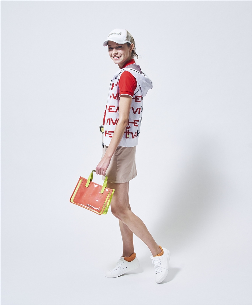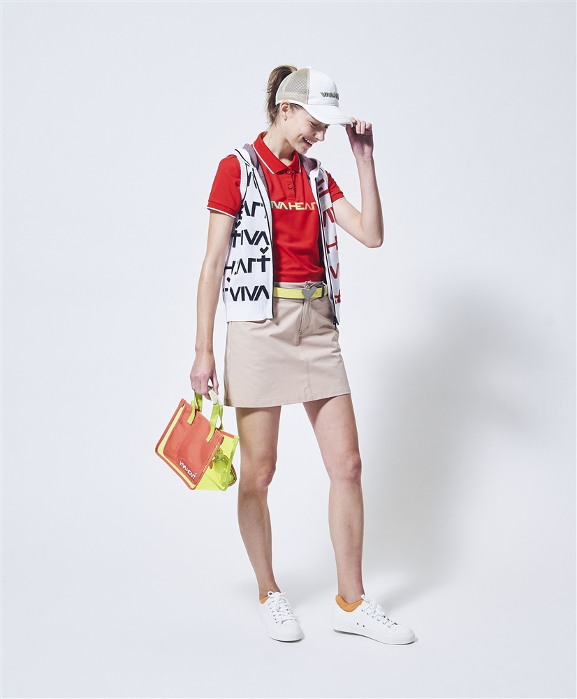 ハートバックルのベルトやPOPなビタミンカラーのスケルトンBAGと合わせることで上品さの中に残したVIVA HEARTらしさがコーディネートのアクセントになっています。