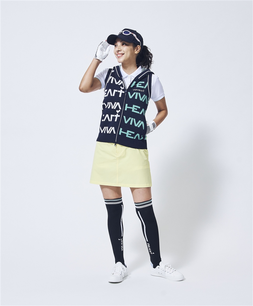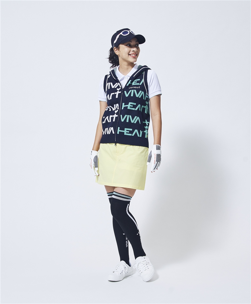 大胆ロゴニットのカラーバリエーションスタイリング。ハッと目を引く明るさと華やかさを持つ春らしいイエローのカラースカートをボトムに取り入れ垢抜けた着こなしに。ベーシックカラーのオフのポロを合わせ、ネイビーで引き締めることで個性派な印象のスタイリングの完成です。