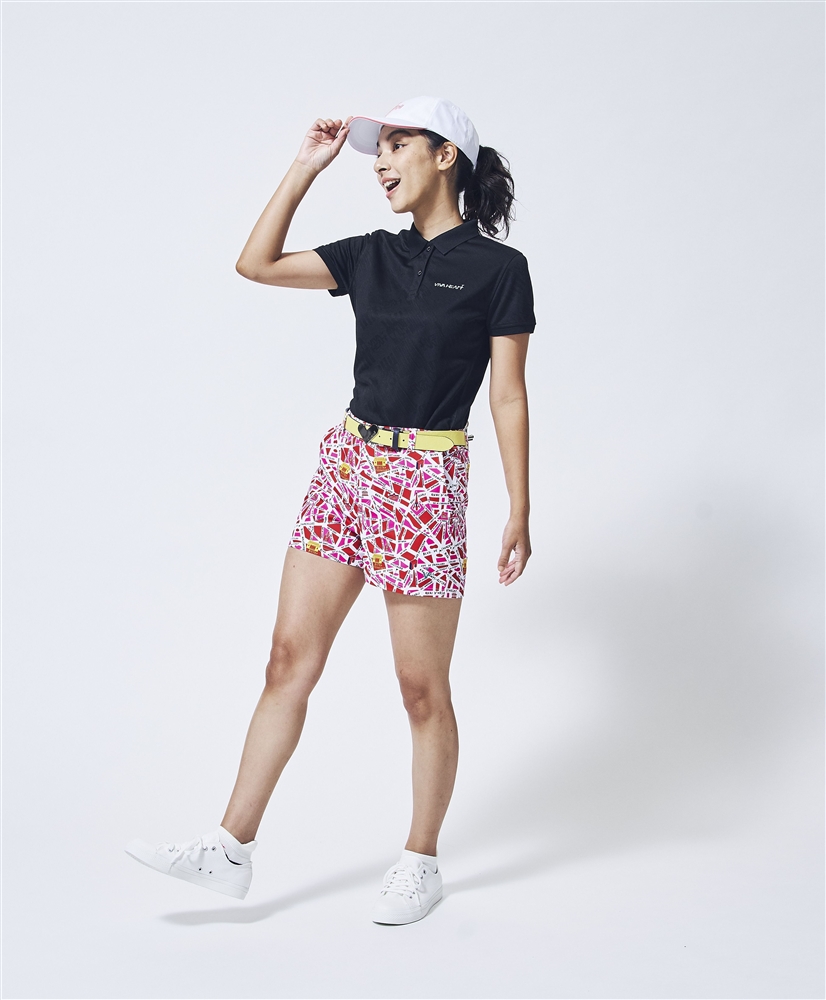 マップ柄を用いたボトムに、編地の凹凸を利用したジャガード柄でテーマ性を表現し、楽しさを入れ込んだリンクス組織のポロシャツを合わせたスタイリング。鮮やかな色合いとトーナルなカラーのポロシャツを合わせることで楽しく明るいビバハートだけではない落ち着いた印象も持たせるスタイリングです。