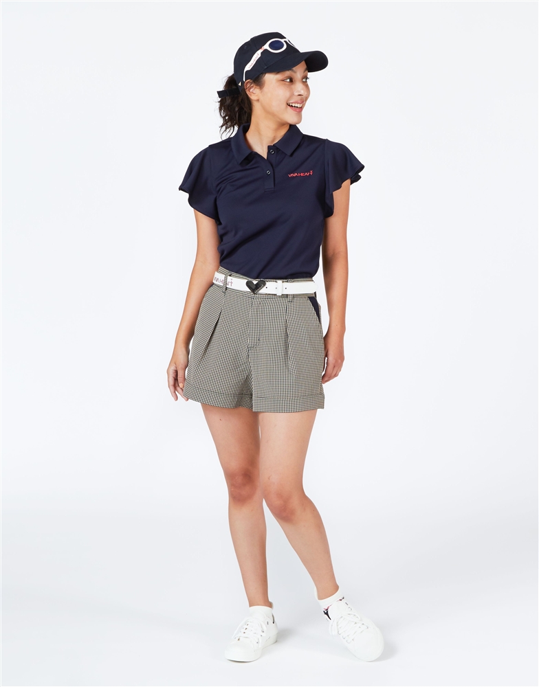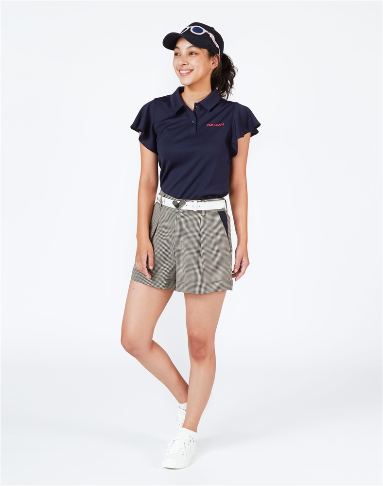 軽やかできれいなシルエットのラッフルスリーブに、裾をダブルにしたキュロット風でガーリーな印象のショートパンツのスタイリング。ラッフルスリーブは吸水速乾性とUVカット性を持ち合わせたカノコ素材を使用しており滑りの良い着心地。ショートパンツは夏場の暑い時期に重宝するシアサッカー素材。クールマックスの糸を使用しているのでサラリとした肌ざわりと吸水速乾性、ナチュラルストレッチを持ち合わせます。風が通る爽快な着心地も着こなしを演出してくれる、ゴルフに行くのがより楽しみになるスタイリングです。