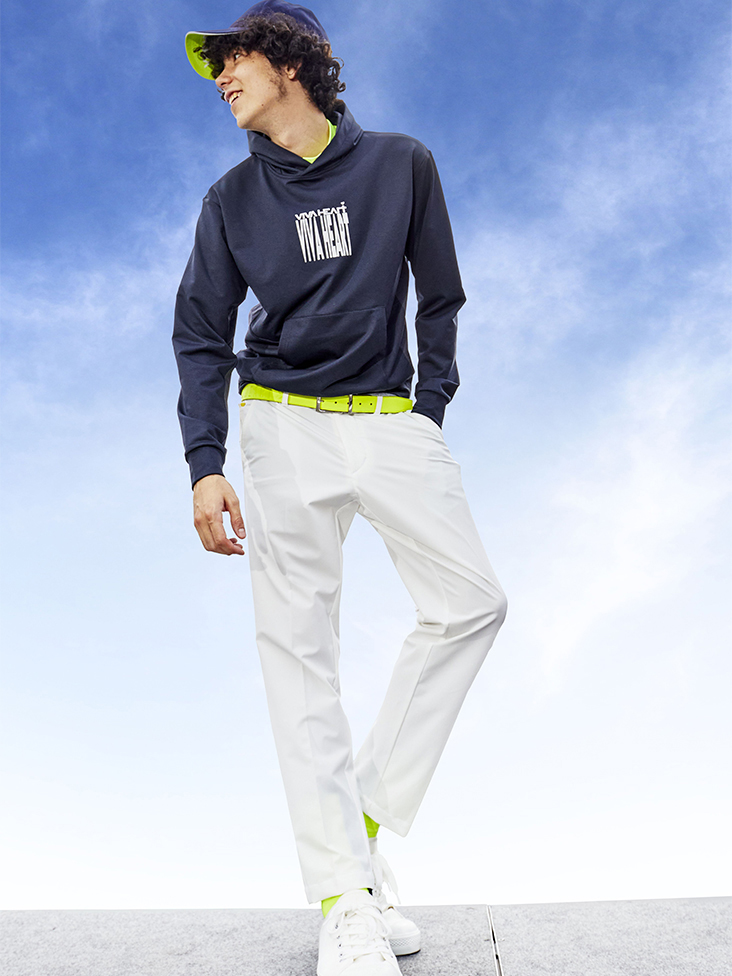 2トーンで構成されたクールな印象のフーディースタイリング。袖下から脇にかけてはストレッチ布帛で切り替えているのでスイング時の脇下のゴロつき感も軽減されています。又、フードは若干小さめで、フードがダレ過ぎない様に台衿をつくりコンパクトにまとまるような設計。練習時でもラウンドする時もこれからはフーディーの出番が増えそうです。