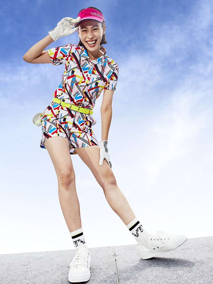 迷路に迷い込んだ様な幾何学模様の総柄セットアップのスタイリングはおしゃれな印象でゴルフ場でも映えること間違いなし。