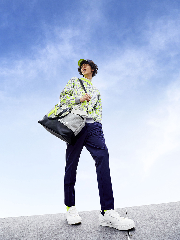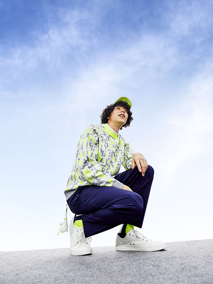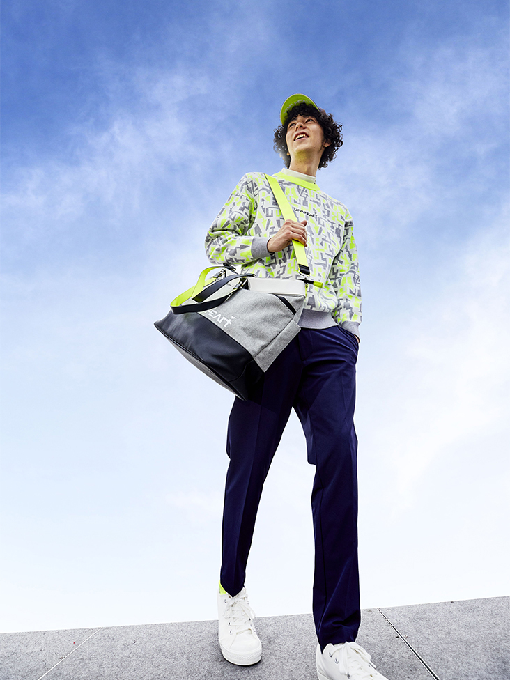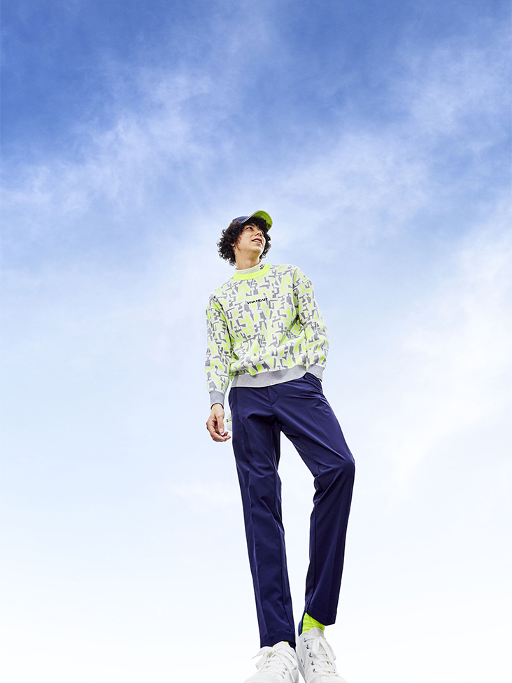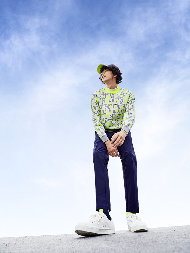 入り組んだジャガード柄で作られたタイポグラフィー柄はまるで迷路を冒険するようなグラフィック。ネオンカラーでブロッキングされた見え感が取り入れやすいモード感とストリートのエッセンスを演出する秋の代表スタイリングです。