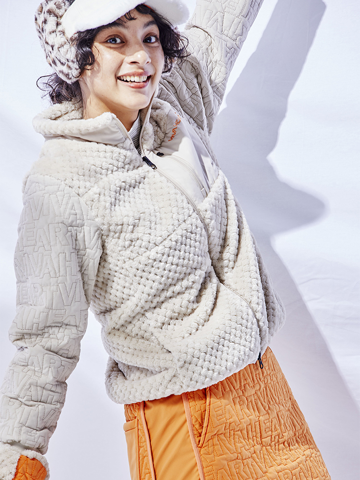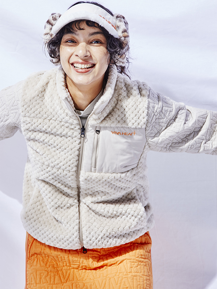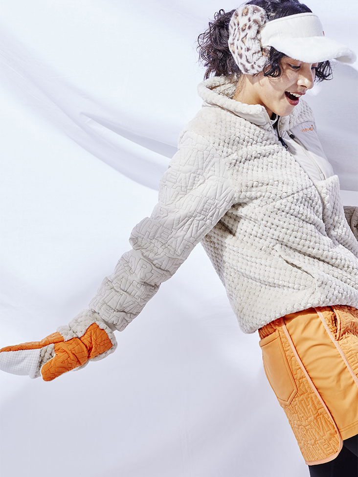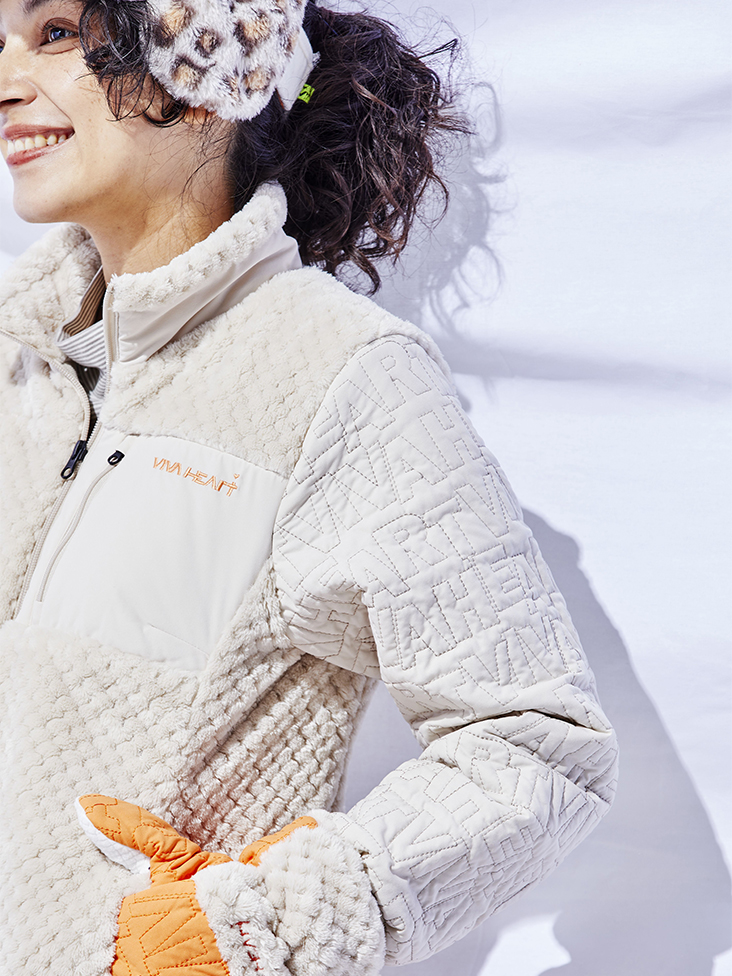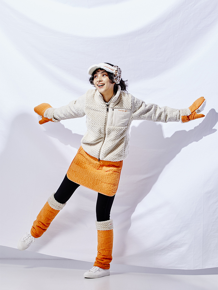 円形にボアが区切られたドット柄のような見え感のサークルボアブルゾンのスタイリング。袖はロゴタイポグラフィのキルティングになっており、動きやすさや防寒だけじゃない、可愛さのあるアイテムになっています。