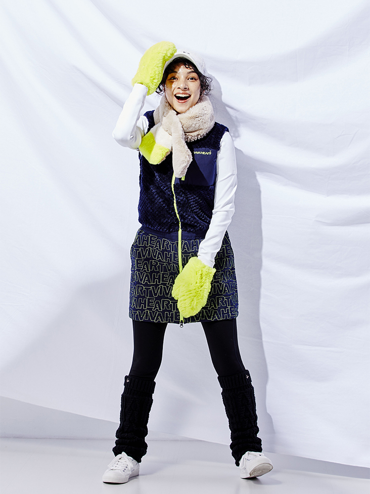 ふわふわが目を引く可愛いワンピースはスカート部分のキルトがロゴタイポグラフィーになっており、ファッション性を兼ね揃えたデザイン。ストレッチのある中綿キルティングなのでゴルフに最適な機能も備わっており、冬のゴルフに大活躍するスタイリングになっています。FLUFFYな小物が可愛さを演出してくれるだけでなく、首周りに置くことで小顔効果も期待できそう。