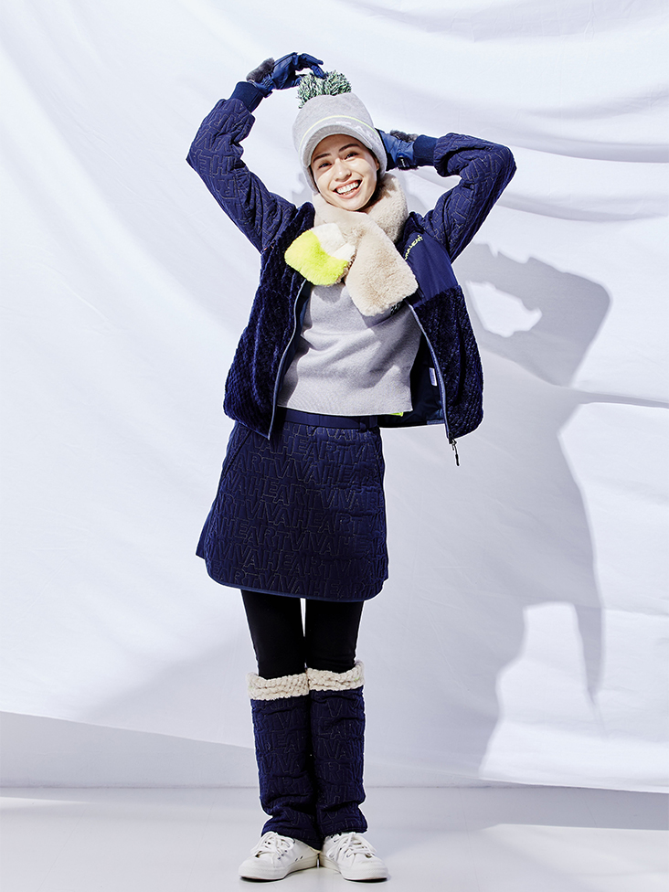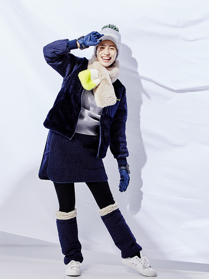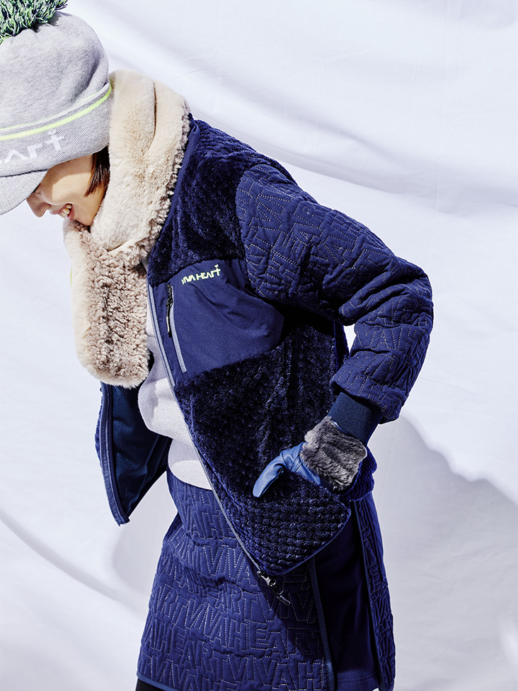 袖部分のキルトがロゴのタイポグラフィになっているボアブルゾンを同じ柄のキルティングスカートと合わせた冬のゴルフでも暖かく快適に過ごせるスタイリング。