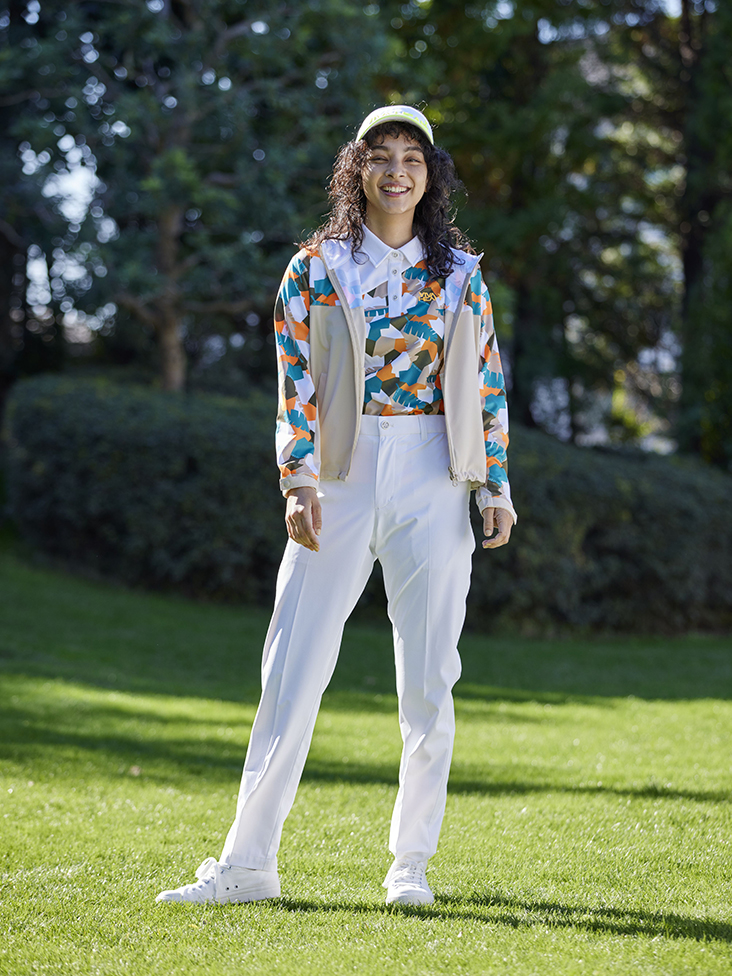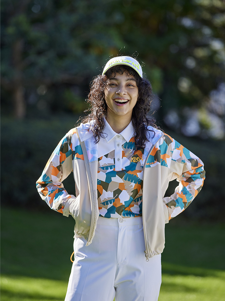 「VIVA FLOWER MARKET」のテーマを元に春立ち上がりは、大胆に花びらとリーフのモチーフをジオメトリックパターン目を引くネオンカラーがVIVAっぽく元気な柄で シャツとブルゾンでセットUPで アウター選びに困りません ボトムは機能的なマジックウェストの仕様なのでウエストのラインは楽なのにすっきり見えます。