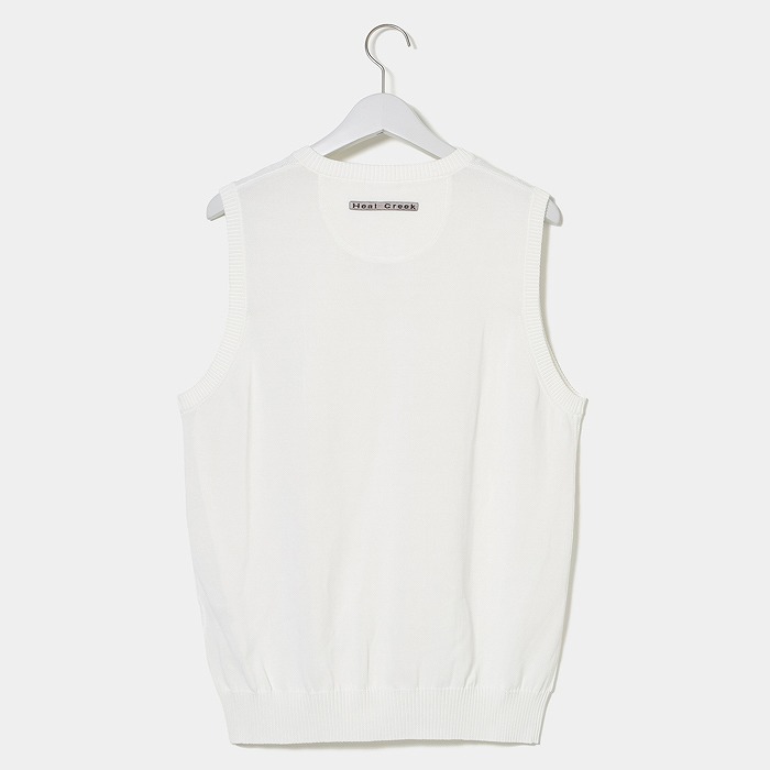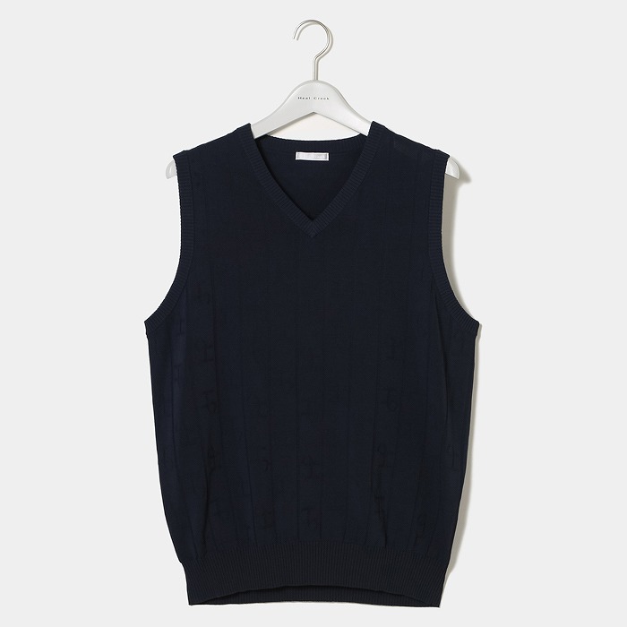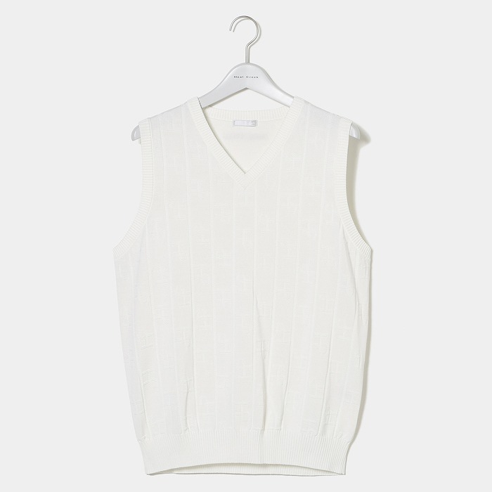 Hcロゴをタテに凹凸編で表現。バーチカルでシャープなイメージ。無地ベースなので何にでも合わせやすいのが特長。首元もシャープなVネックでスッキリとした印象です。毛羽の少ないコットンとセラミック効果のあるポリエステルを使用した素材で紫外線から肌を守る機能と防透け効果もあります。また程良いストレッチ感・軽量感・清涼感も特徴です。C/#18は杢糸で上品なイメージに仕上がっています。合わせやすいカラーリングで長く着用できる12ゲージの編地です。・ストレッチ