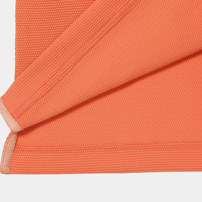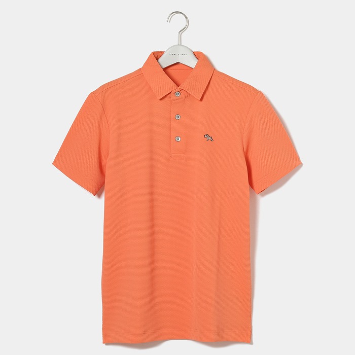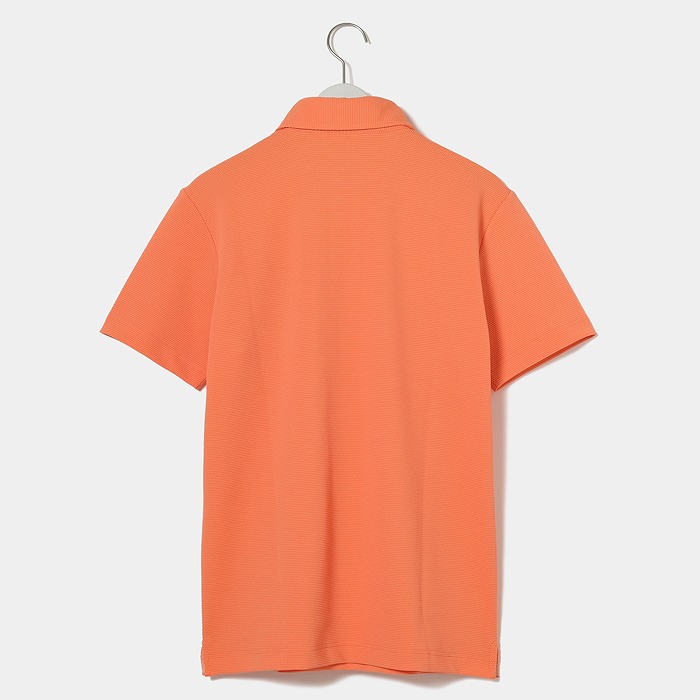アートピケは適度な肉感に、表面の凹凸が特徴のある素材。まるでアートのような美しい表面感は存在感もあり見映えよく映ります。ストレッチも良く、動きやすいのでプレーに最適です。今シーズンはシンプルなデザインですが衿幅、台衿幅は綺麗に見えるようにミリ単位でこだわって作っています。スッキリした印象で第二釦の位置にもこだわり、第一釦を外しても開き過ぎず程よい開き具合になるようにしています。さらに、肌あたりが良い裏側を台衿に使用しています。メタルボタンでさらに上品なイメージに仕上がっています。