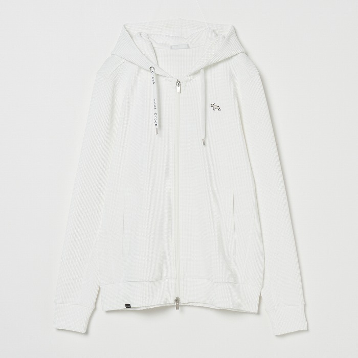 若々しいフルジップのフーディーは、凹凸のある表面感豊かなワッフル素材を使用し、しなやかなストレッチ性と独特のキックバックの良さが特徴です。脇ハギや袖下のハギにより立体的なシルエットを演出し、洗練されたデザインが魅力的です。フードは2重でしっかりとした仕上がりであり、ロゴプリントが施されたスピンドルが特徴のフード付きジップアップパーカーです。 シルバーヘンリー刺繍もポイント。