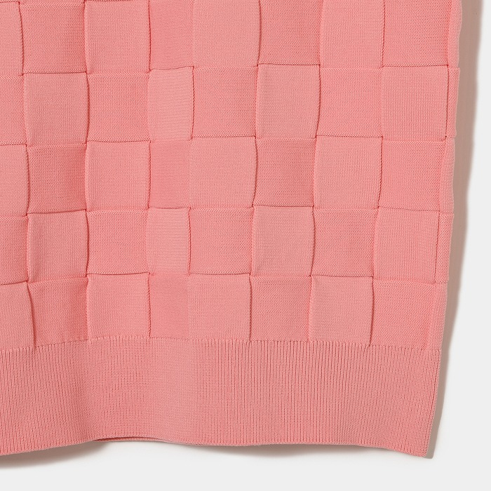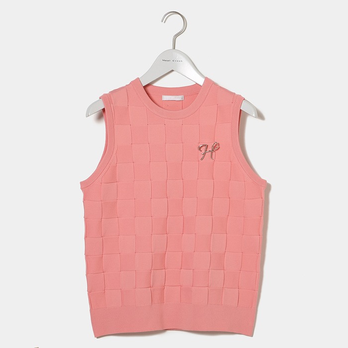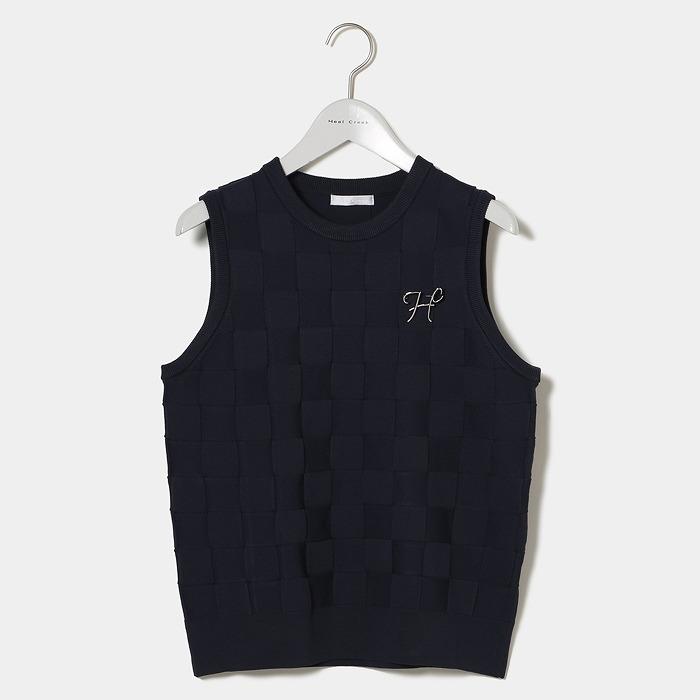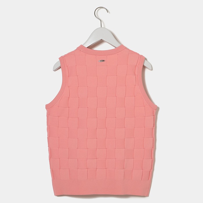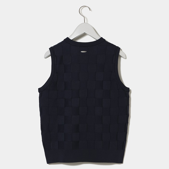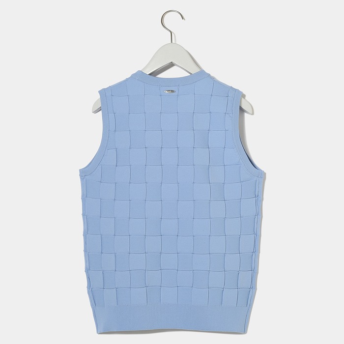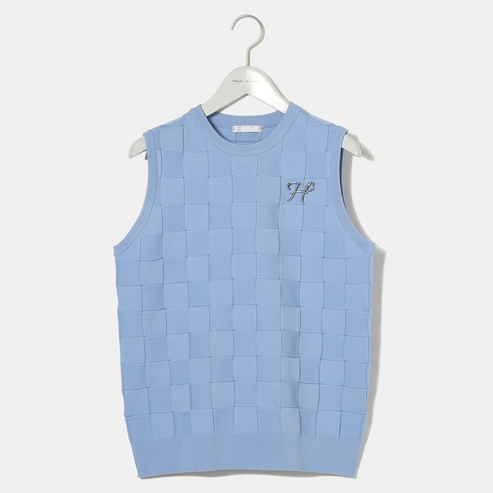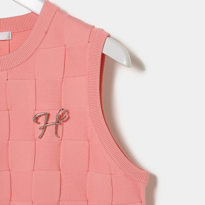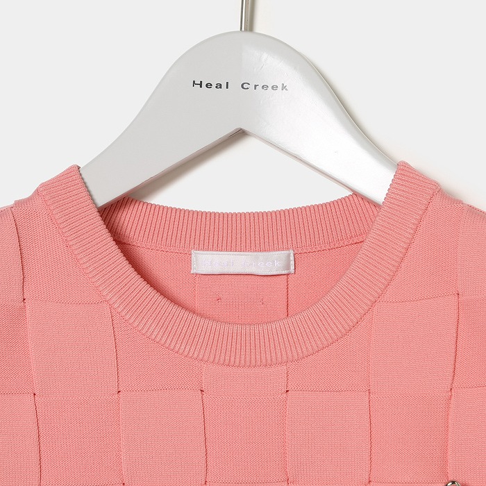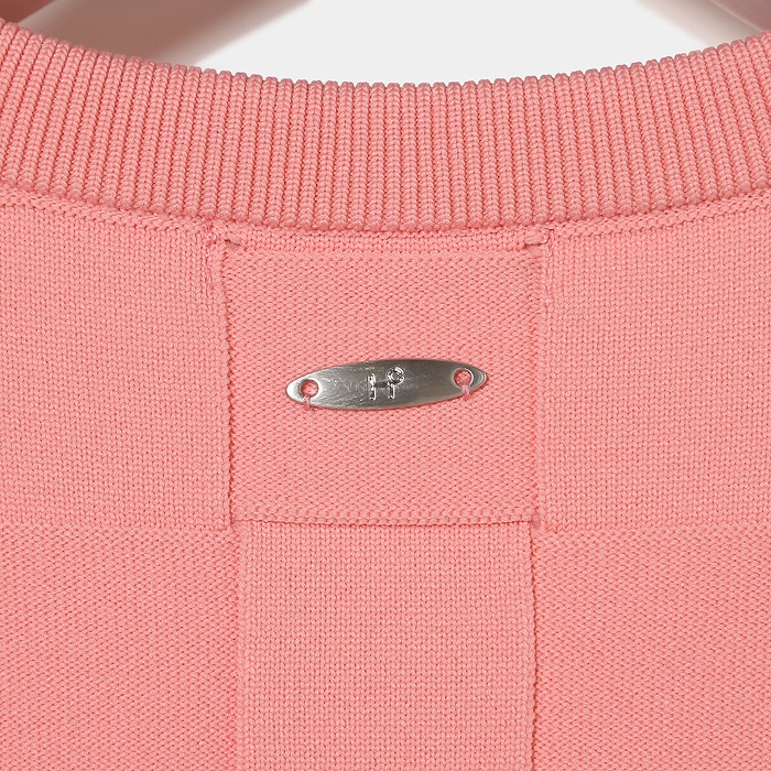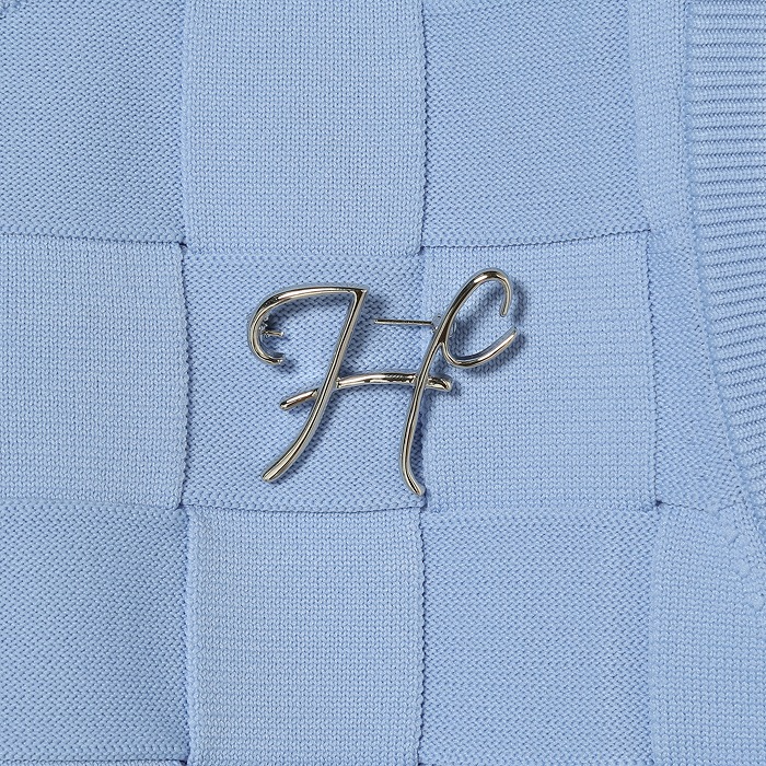 軽量のニットで格子編みを表現した表情のあるニットです。凹凸感のある編地が見た目の可愛さと肌との接触面を少なくしさらっとした肌当たりを実現しています。ロゴブローチ付きで胸と後ろ衿にきりっとシルバーを効かせたデザインになっています。