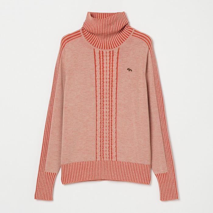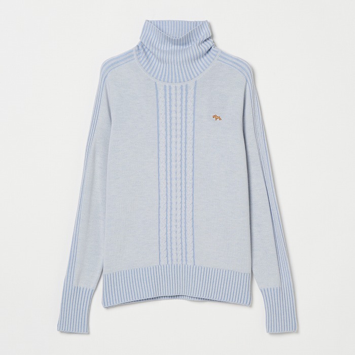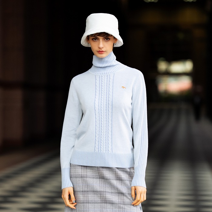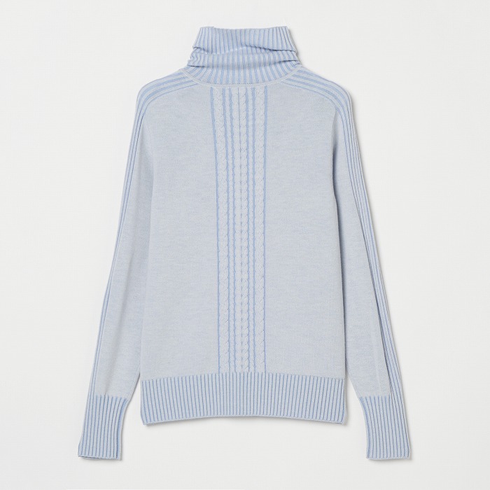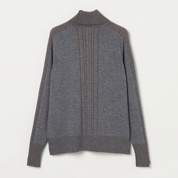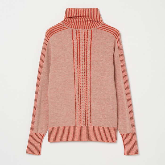 今シーズン一押しのベーシックニット。表と裏に異なる色を使用したプレーティングという手法を用いたニットです。2色の糸が織りなす複雑で曖昧な色味を活かして、シンプルな縄編みを取り入れました。ややゆとりのあるサイズ感で、カジュアルにもコンサバにも使いやすいデザインになっています。ゆとりのあるタートルネックになっており、伸ばしてクシュっと着ても可愛らしく決まります。