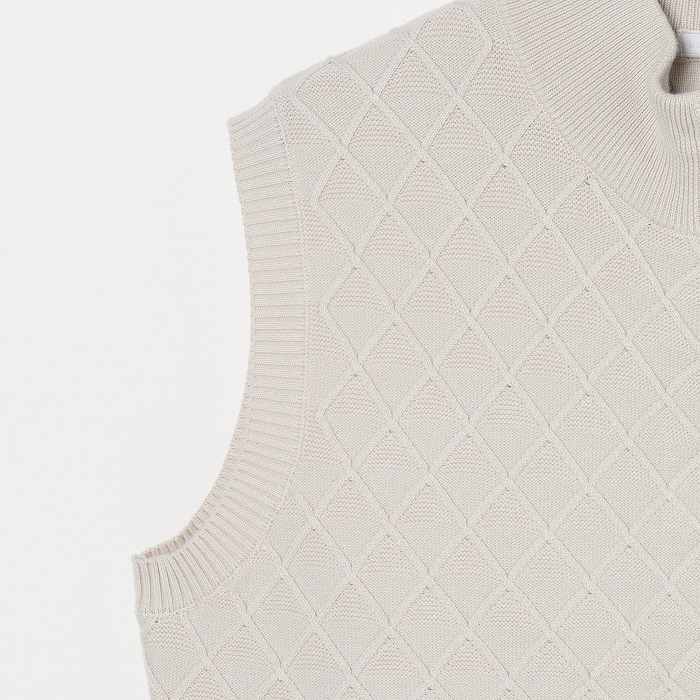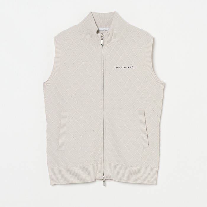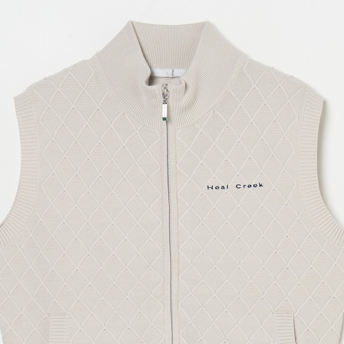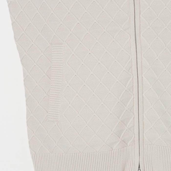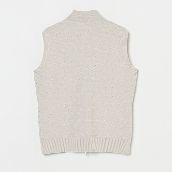 季節の変わり目に活躍するニットベスト。網目のような地柄模様が無地ながらも存在感を放つアイテムです。きらきらとしたボールチェーンが覗くような逆開のメタルファスナーを使用しています。同素材のスカートと合わせれば、上品なセットアップになります。
