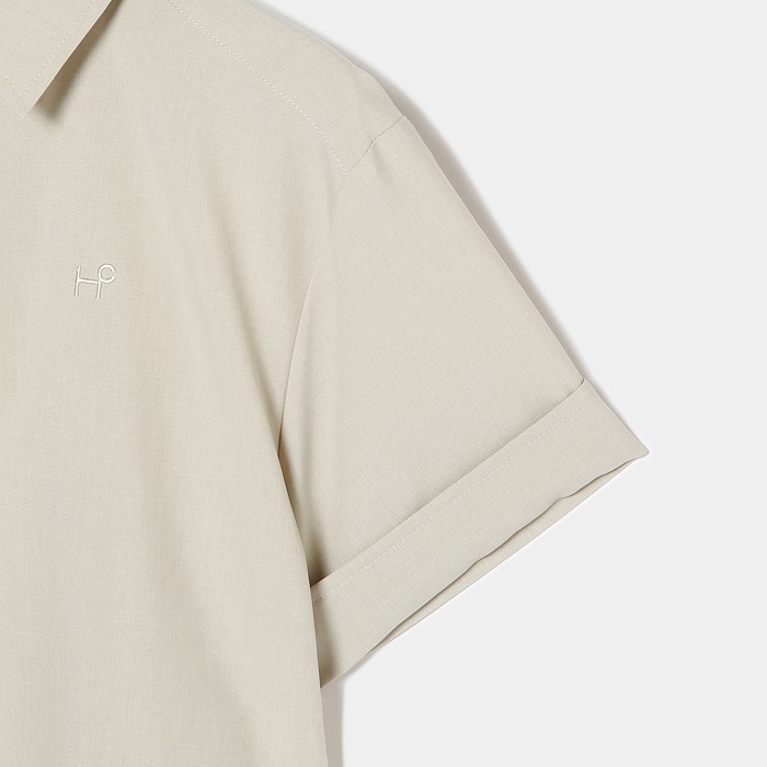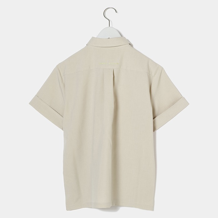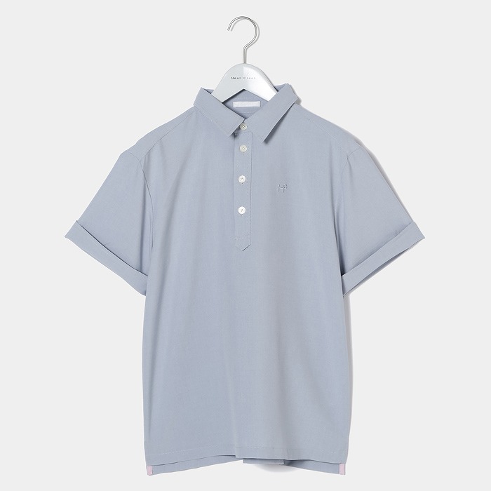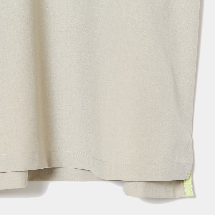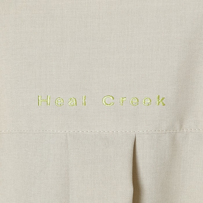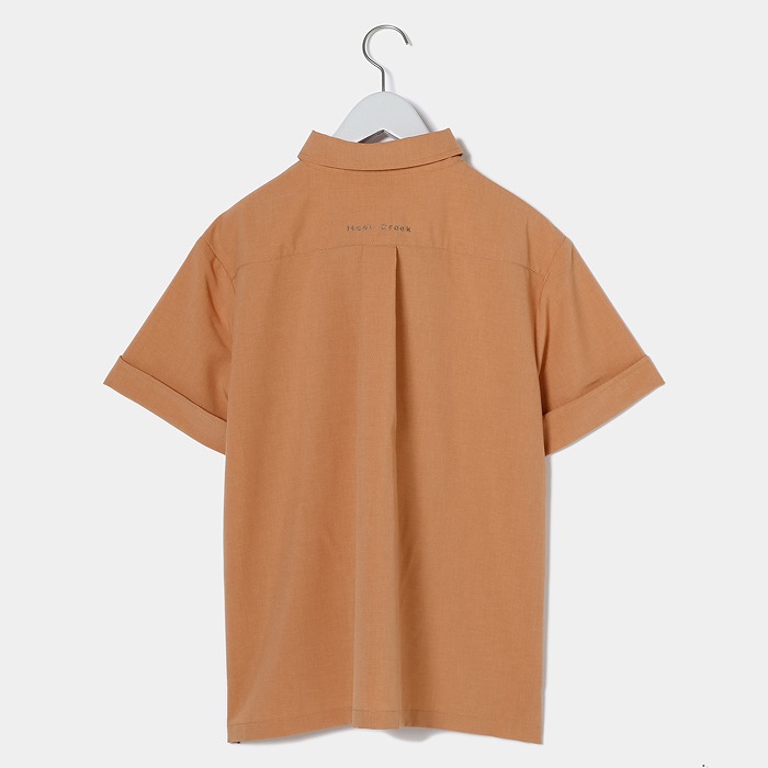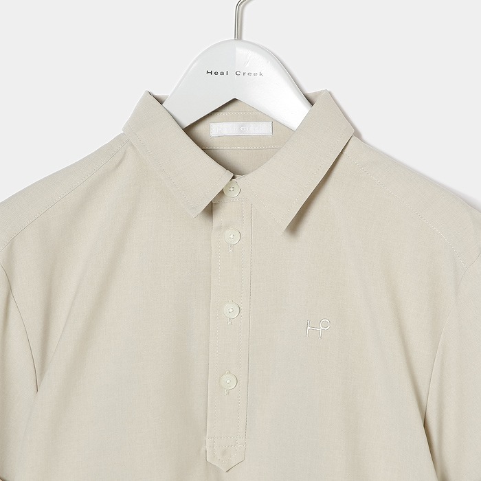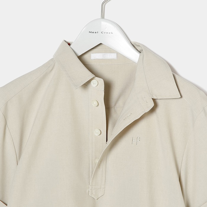 麻のようなナチュラル感と、ドライな風合いを持つ多機能素材のリフラクス。シワになりにくく、繰り返しの洗濯でも毛羽立ちが少なく、きれいが長持ちするうえに、接触冷感、吸汗速乾、UV遮蔽率80と、夏に頼もしい素材です。メランジ調の色合いもポイントです。デザインはドロップショルダーでゆったりとしたシルエットが新しいシャツ。カジュアルなデザインですが、お揃いのショートパンツと合わせると清潔感漂うルックスになるところがヒールクリークならでは。