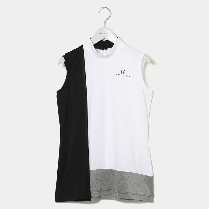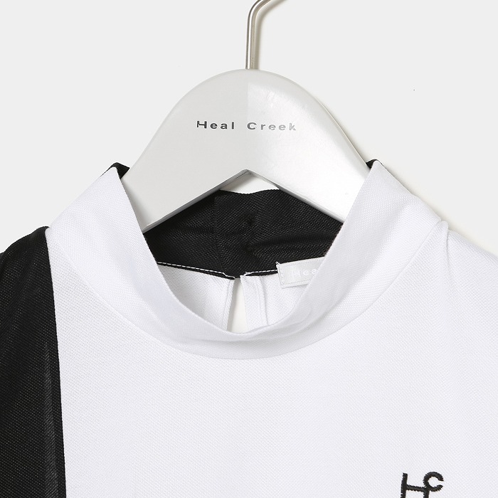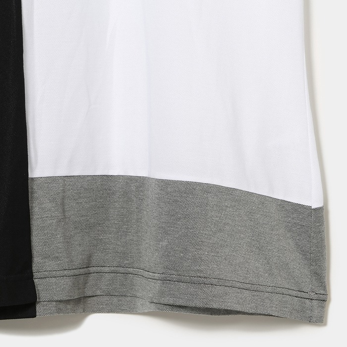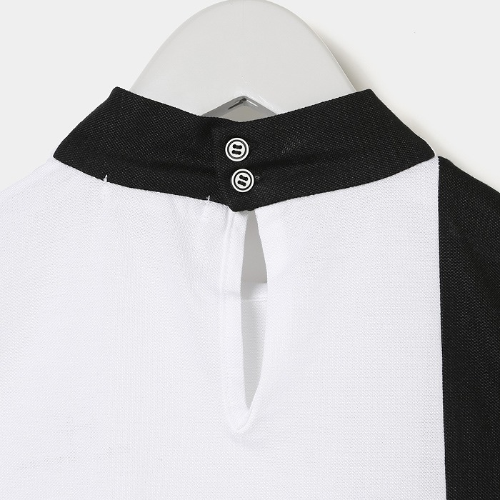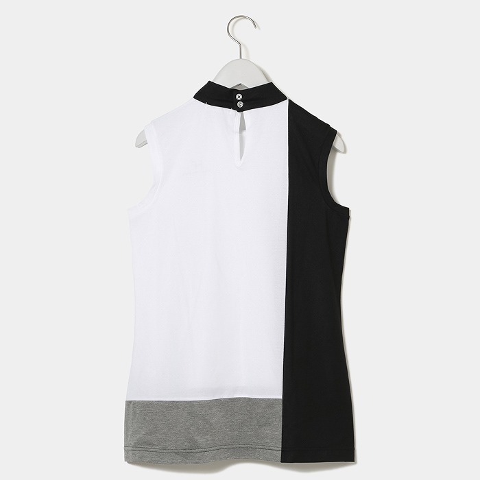 ペットボトル原料を使用したエコな鹿の子を使用したチュニック丈のトップス。3色を縦横に切り替えて涼しげで軽快な印象に仕上げました。ドライスーティングのパンツ(002-71313)と合わせてエレガントなルックスをお勧めします。後中心釦あき。