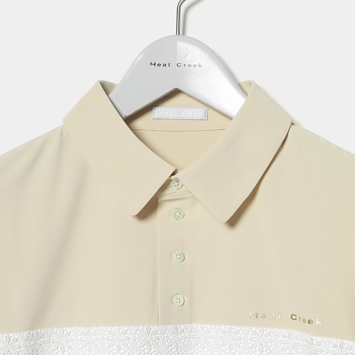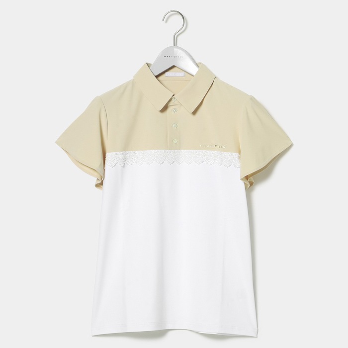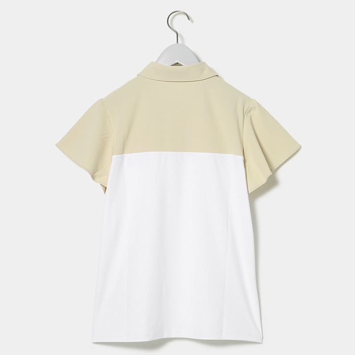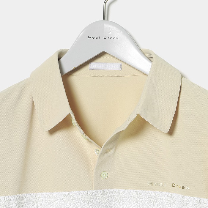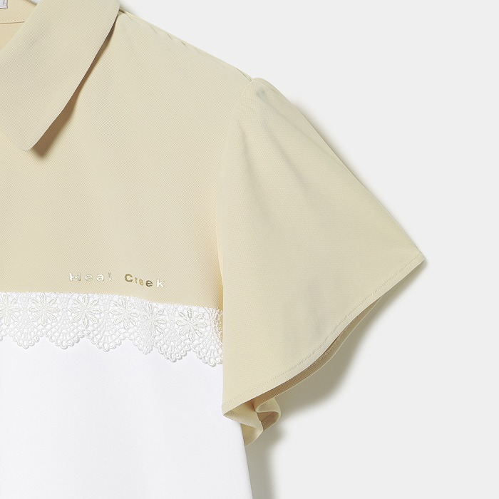 まだまだ暑さの残る季節に、いつもとは一味違うフェミニンなディテールが特徴の半袖シャツの提案です。華奢なフレアースリーブは二の腕をカバーするだけでなく、くっきりとした日焼け跡がつきにくいという利点もあります。さらに、配色の切り替えにレースが使用されており、エレガントな雰囲気を演出しています。小さな衿と釦は、シンプルながらも個性豊かな印象を与えます。もちろん素材には吸水速乾やUVカット機能がついています。