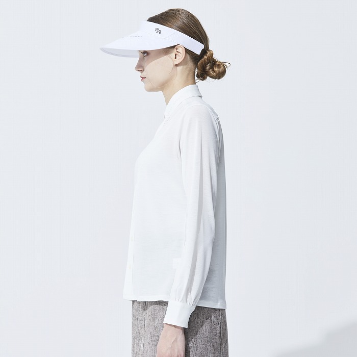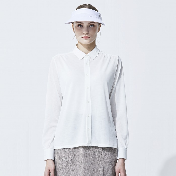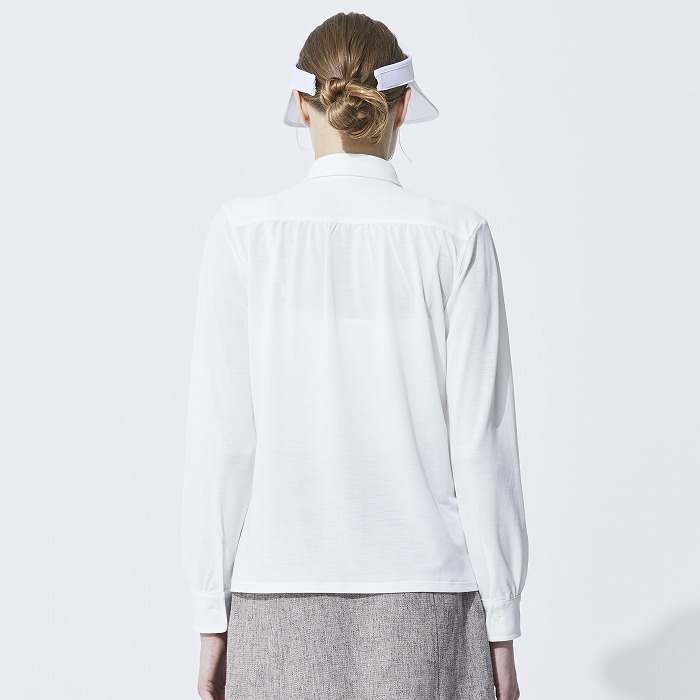 この長袖シャツは、ゴルフウェアでは稀少なフロント釦デザインです。通年着用可能な薄手でサラサラな素材が心地よく、肩部分に寄せたギャザーが柔らかな雰囲気を演出しています。衿にロゴ、カフスにはアイコンのヘンリーが同色で刺繍されています。一枚で着ても様になり、ジャケットやニットのインナーとしても活躍する便利なアイテムです。抜群のストレッチ性で袖を通した瞬間にわかる心地良さをぜひ体験してください。