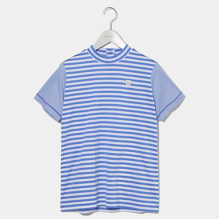 60/2のシルケット加工の天竺のハイネックシャツ。身頃は広幅のボーダー、お袖は細幅のボーダーにすることにより、ボディーとのめりはリが付き、ほっそりと見えます。BCにはグログランテープで開きを作っています。これもチャーミングポイント。