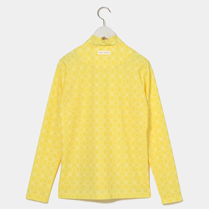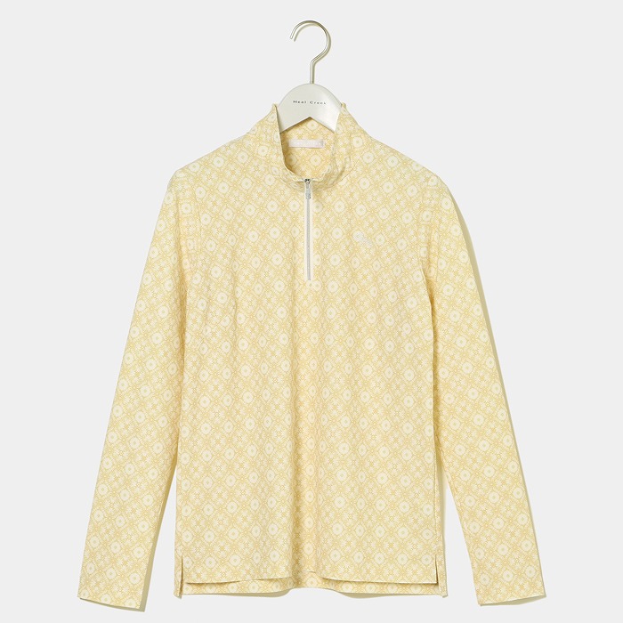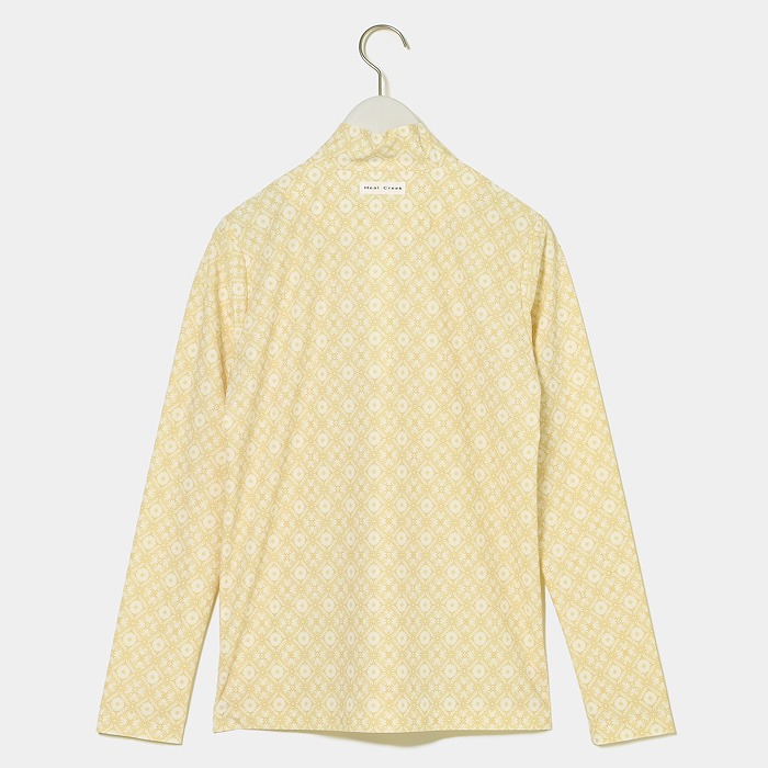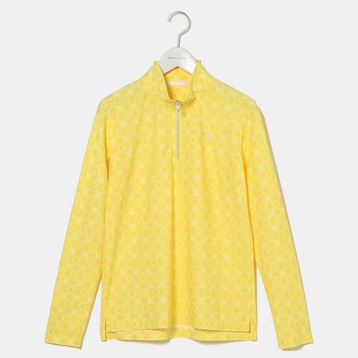 ビンテージ風総柄プリントシャツは、接触冷感、UVカット機能のある素材を使用。超軽量素材で、ツルっとした肌当たりが気持ち良いです。紫外線が気になる夏のゴルフにオススメの軽やかな長袖シャツです。胸元の爽やかな白いストーンのヘンリー君が夏のゴルフムードを盛り上げます。