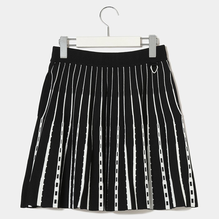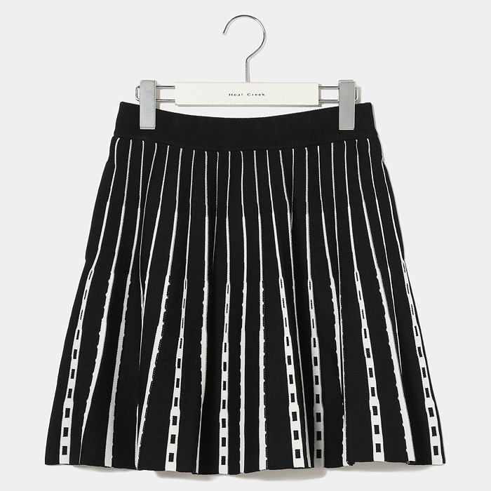 ニットの編み替えでプリーツを表現したスカートです。針目を増やしつつ形を形成していくのでウエスト周りはすっきりと裾に向かってボリューム付けたマーメイド風のシルエットになっています。縦に向かって流れるラインに幅の違うラインを入れることですらっと縦長効果のあるスカートになっています。