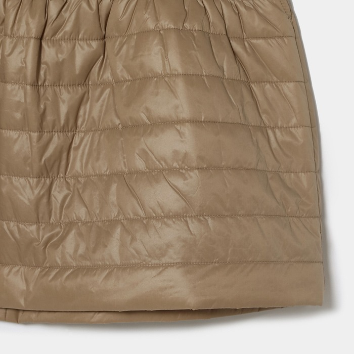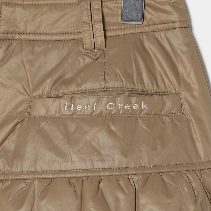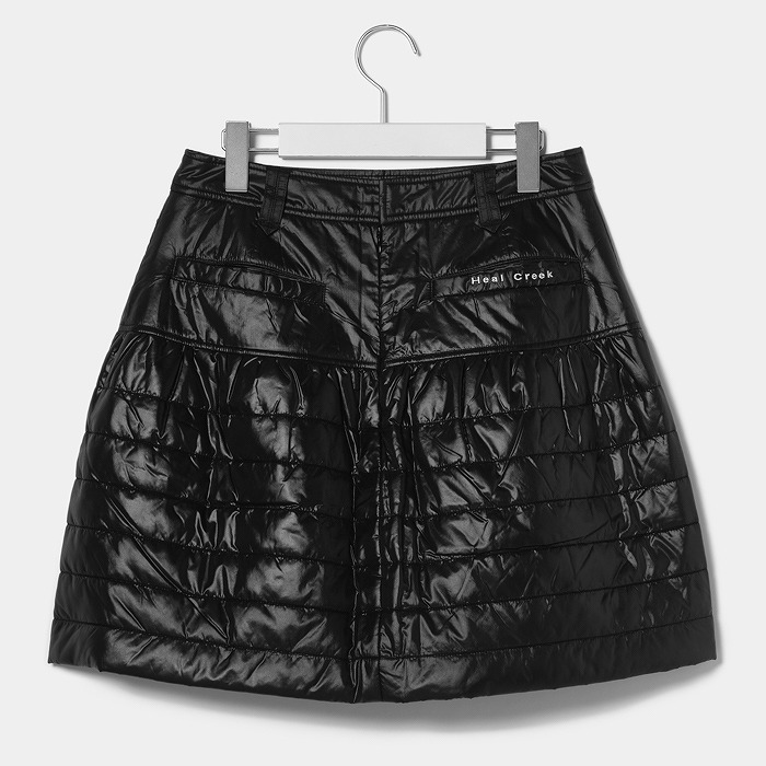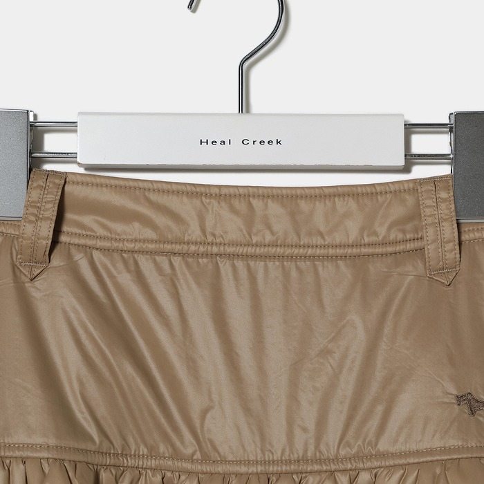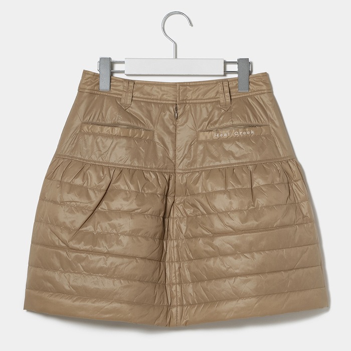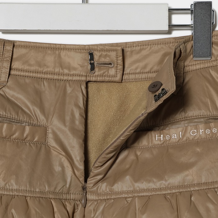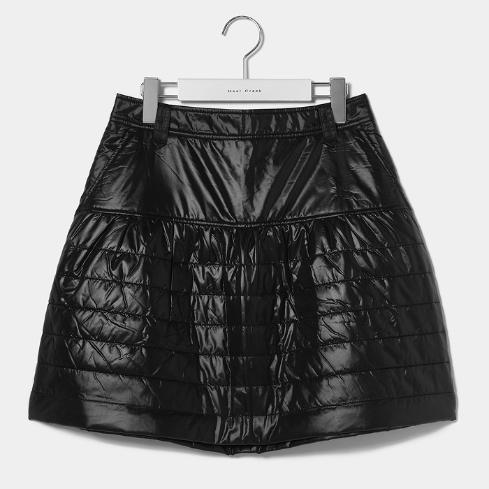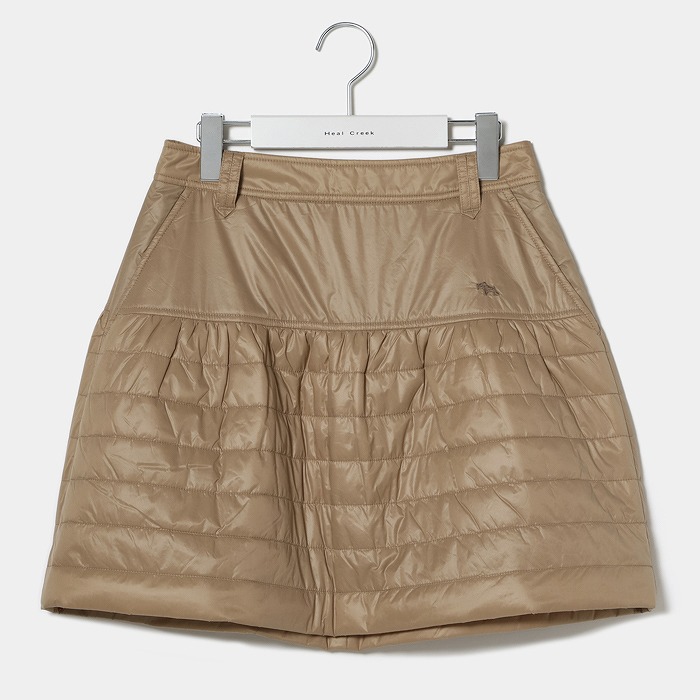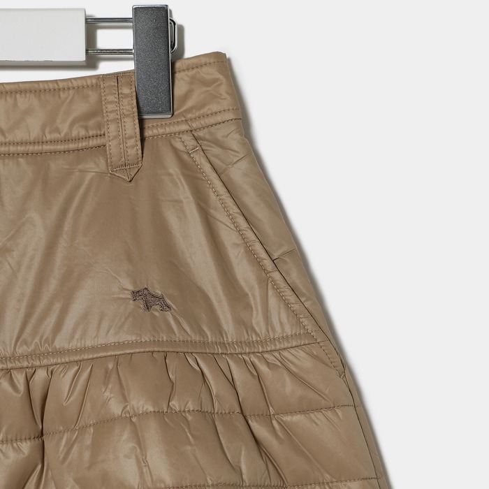 光沢のあるタフタを使用した中綿入りのギャザースカート。履くだけでいつもとは違うチャーミングなスタイルになります。起毛トリコット裏地を使用しており寒い季節でも暖かく快適にすごせます。気になるお腹周りはキルトステッチをなくしフラットに仕上げ、スカート部分はふっくらと仕上げています。かがんでも気にならないよう少し長めのスカート丈になっています。同素材のジャケットと合わせて甘辛バランスを楽しんでください。