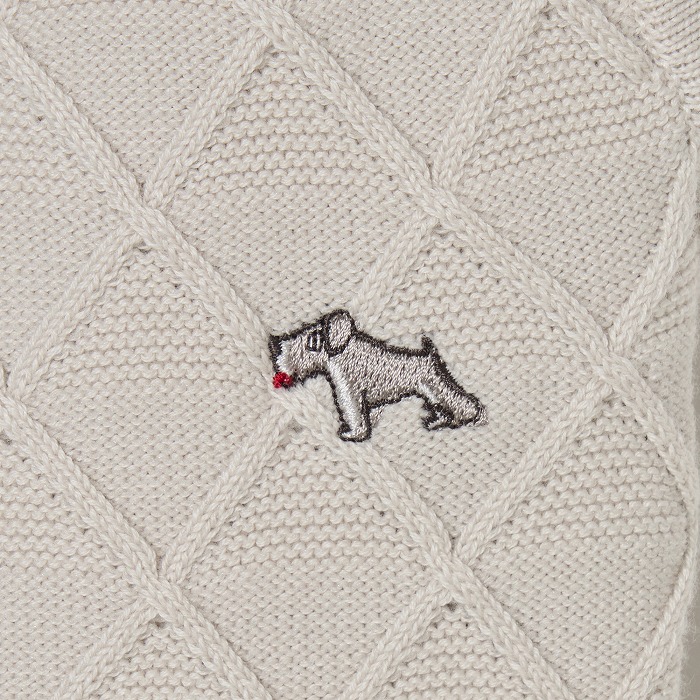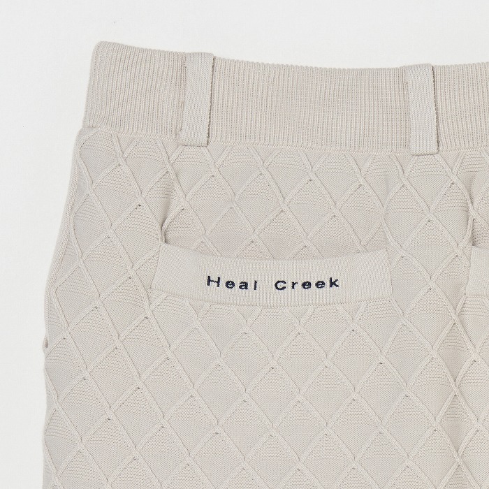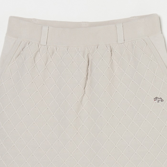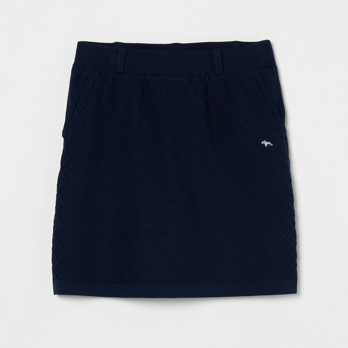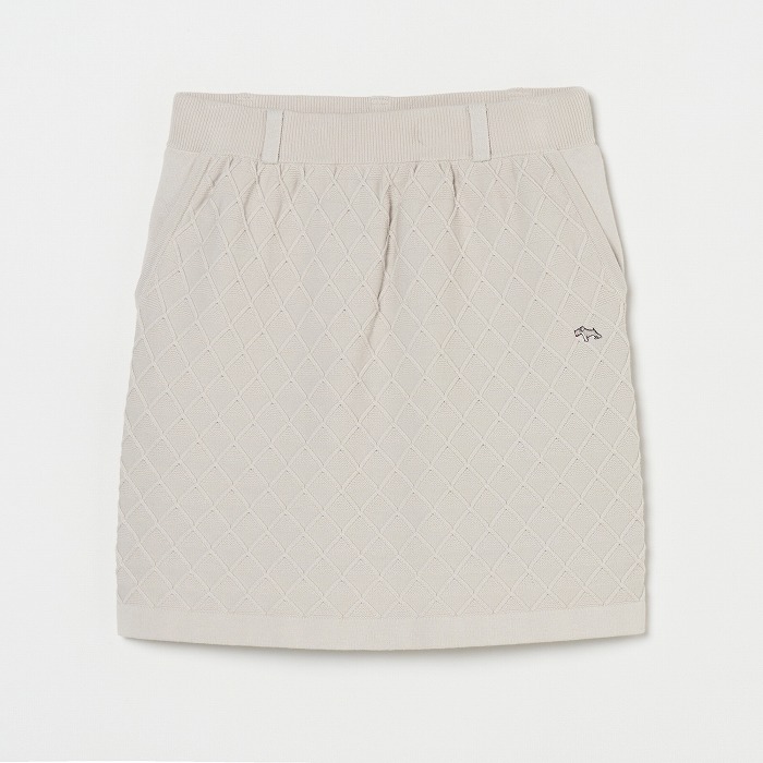 網目のような地柄模様が無地ながらも存在感を放つニットスカート。ウエストは総ゴム入りで前後に2つずつのポケットが付いています。ベルトループには丸カンもセットされており、必要な小物を下げることが出来ます。同素材のベストとセットアップで着こなせば、きちんと感のある上品なルックスになります。(トリコット裏地付き)