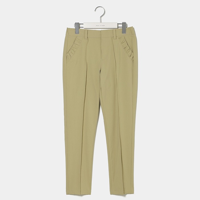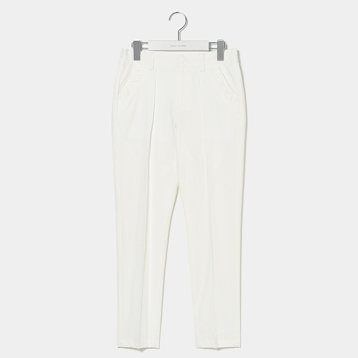 撥水加工を施した4WAYストレッチの素材を使用したパンツです。ウエストゴムですがフロントはギャザーを入れず後ろに少し入れてすっきりとしたシルエットに。ピンタックで足をまっすぐ補正しシルエットを良く見せて、ポケット口には少し甘めのディテールを。楽ちんな履き心地で上品な見え方のゴルフにぴったりのパンツです。