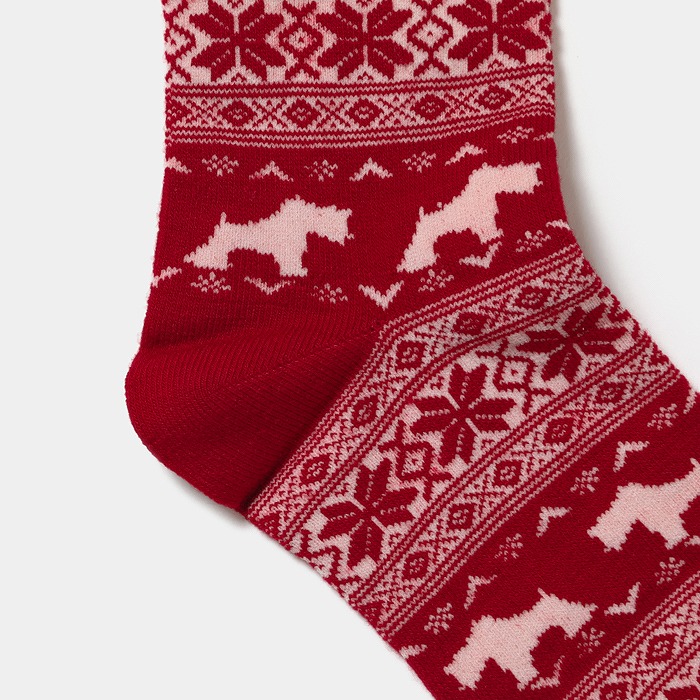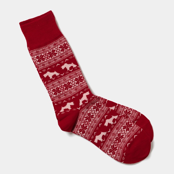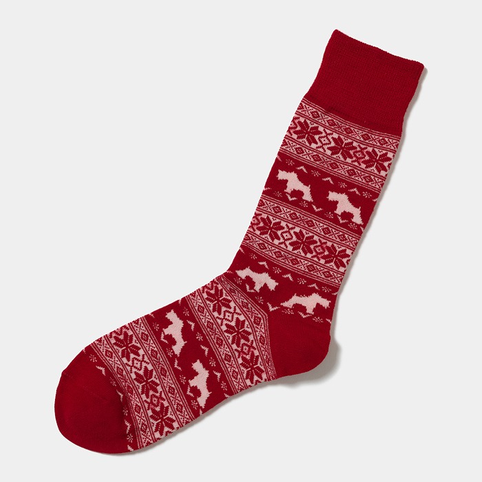ウール混の暖かな糸を使用したノルディック柄のクルーソックスは、ホリデーシーズンにぴったりのアイテムです。アイコンのエアデールテリアのヘンリーが描かれた柄が、楽しい雰囲気を演出します。同柄のセーターとのコーディネートがオススメで、おしゃれな一体感を演出することができます。クリスマスギフトとしても喜ばれること間違いなしです。