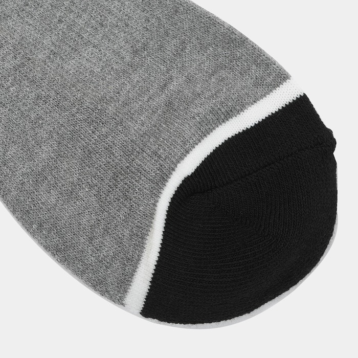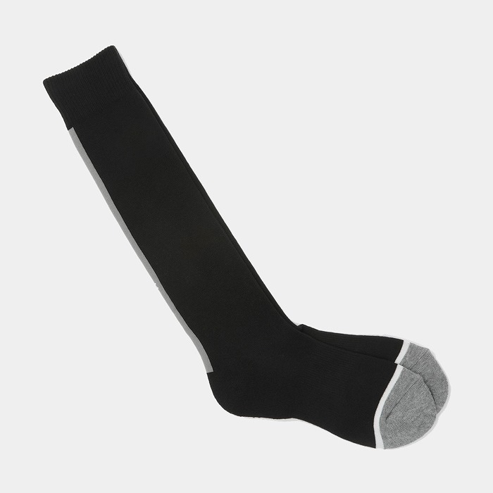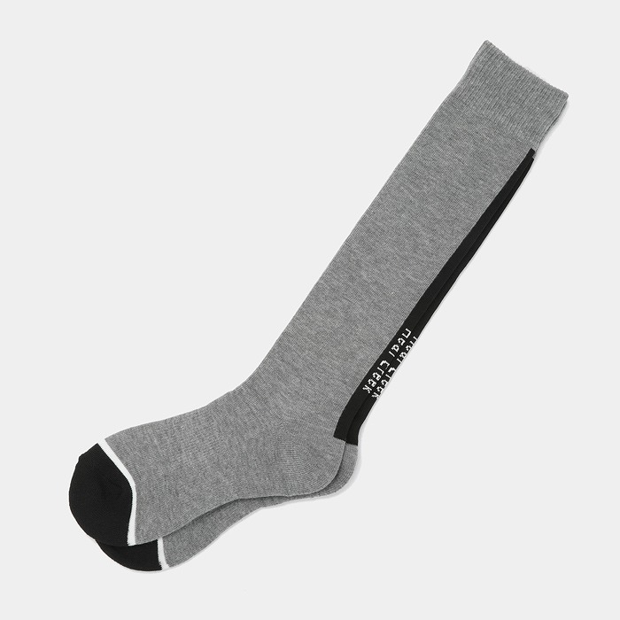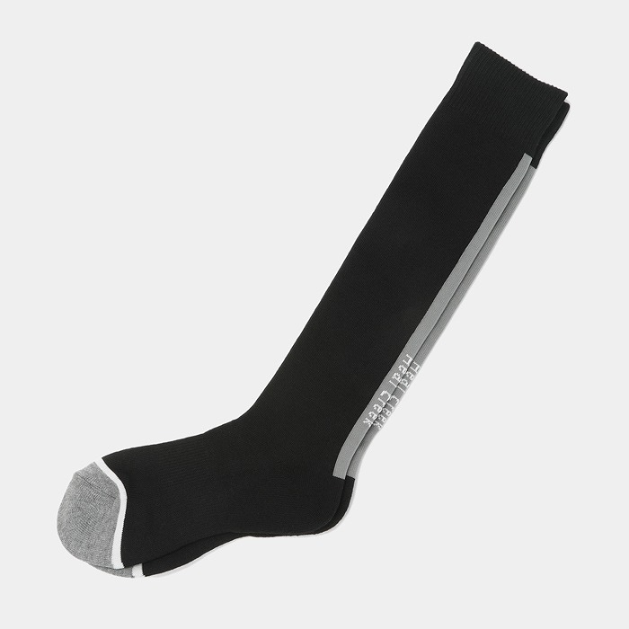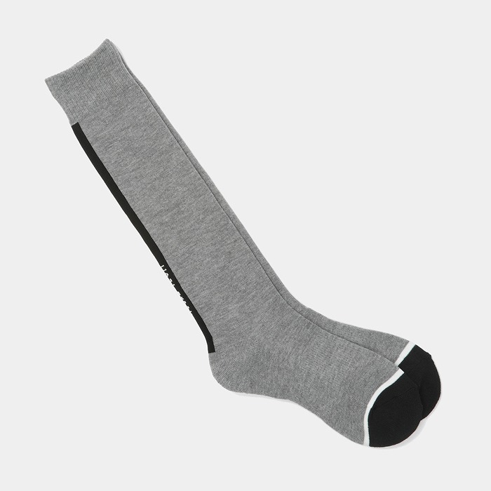 ロゴ入りラインがスポーティーなアクセントになったハイソックス。レッグ部分のメッシュストライプがスポーティーな中にもエレガンスな印象に。つま先、かかとの配色と足首に入ったヘンリー君シルエットのジャガードがオリジナリティーをプラス。ワンピースやスカートのコーディネイトに、年齢問わずに人気のアイテムです。つま先・かかとはパイル仕様で、土踏まずサポート付き。