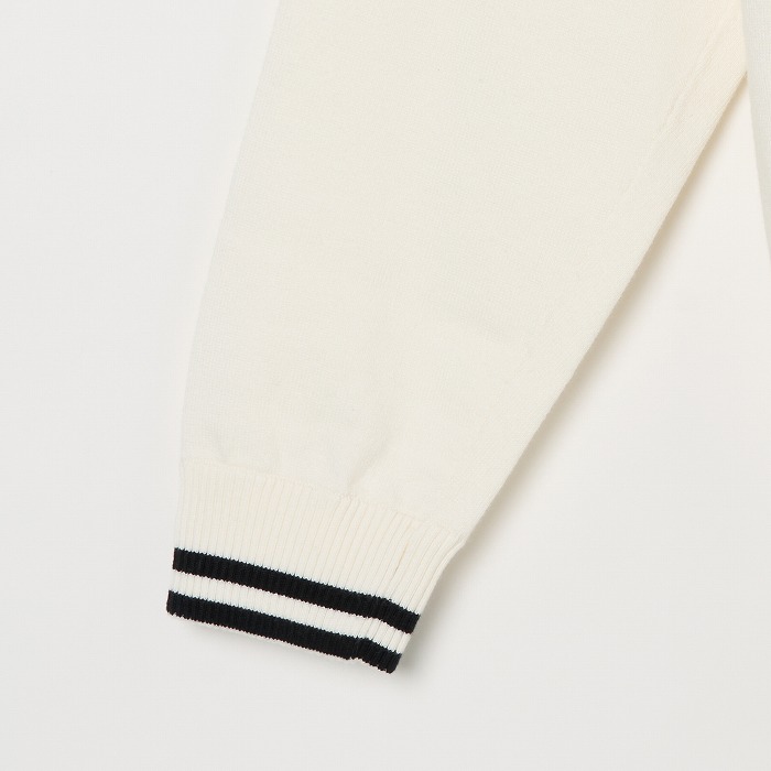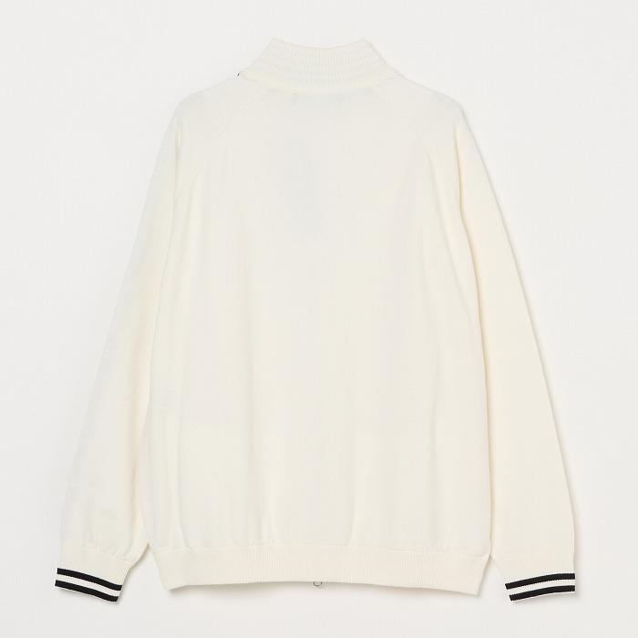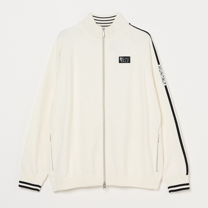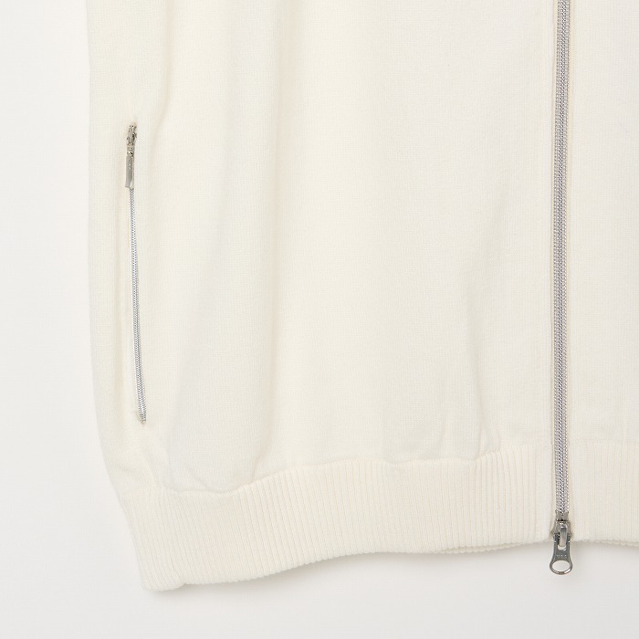 表が2/32の綿カシミア、裏がポリエステルの糸を使いダンボールのような組織でニットのフルジップブルゾンを作りました、裏は起毛素材とのすべりもいいようにつるっとしたポリエステル糸を使っています。左袖に配色ラインとロゴを入れました。