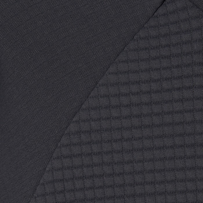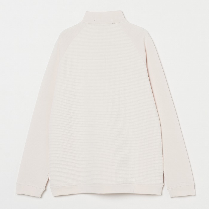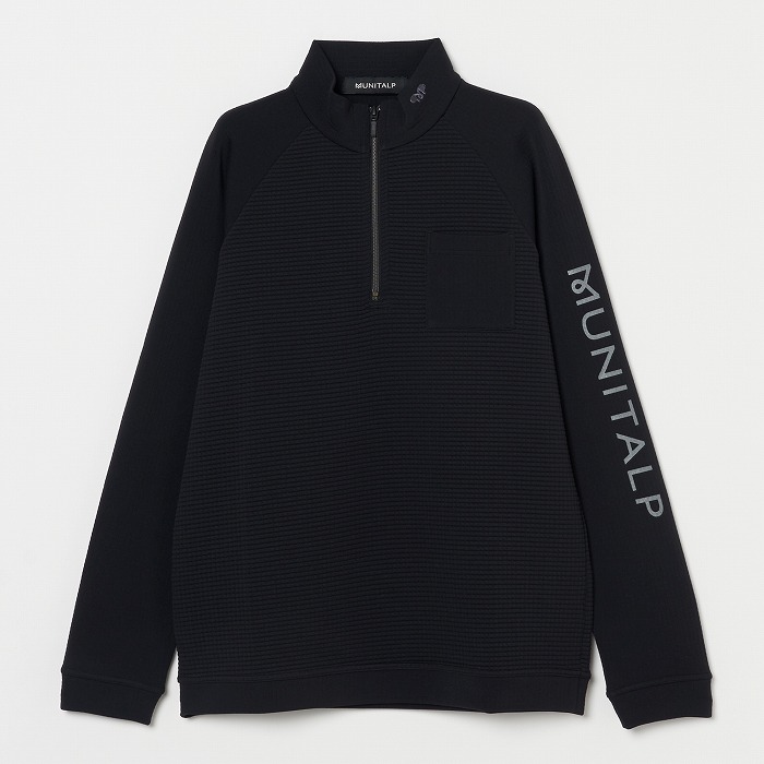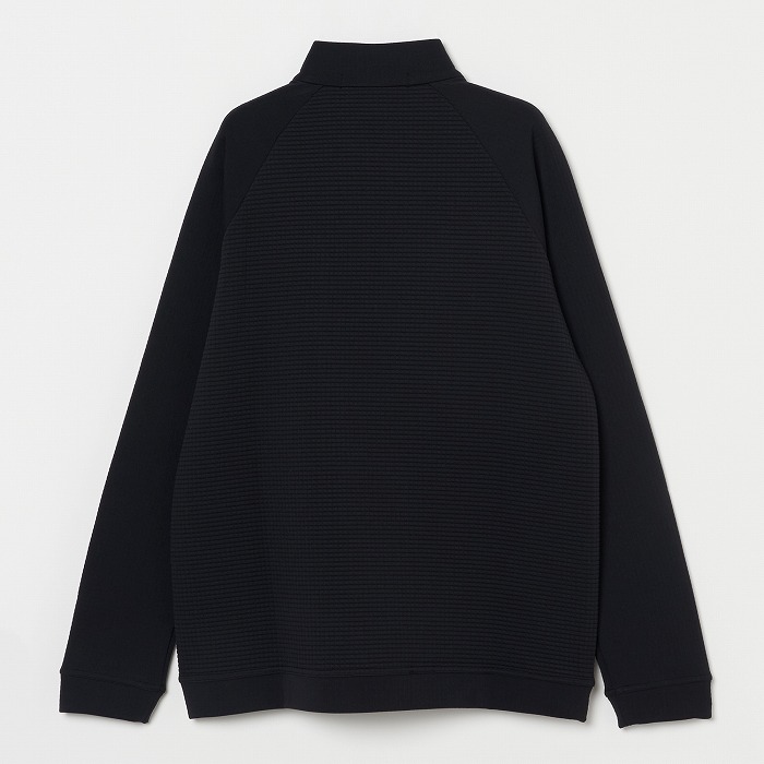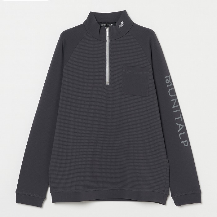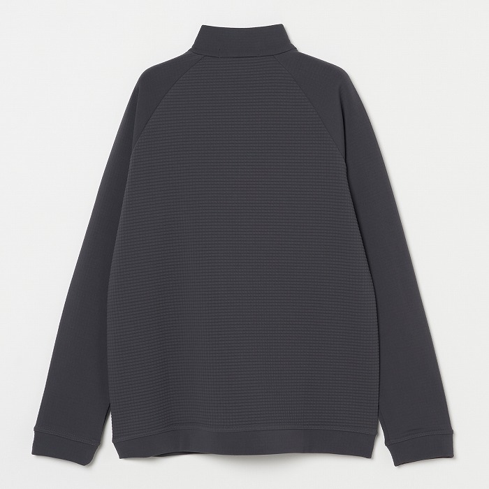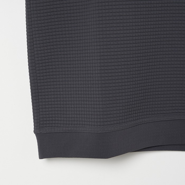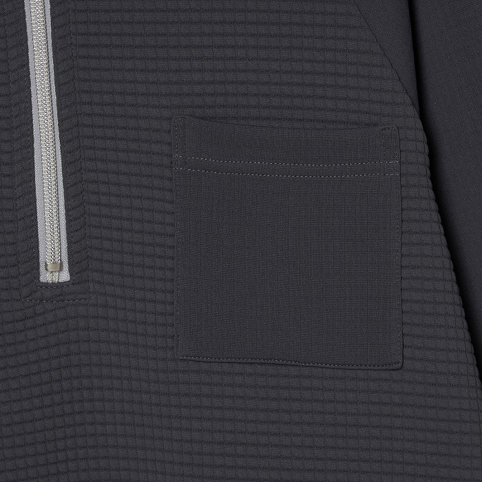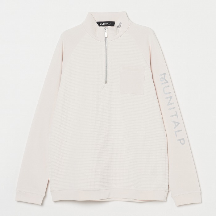 軽さと適度な保温性、通気性のあるオールシーズン着用できるミドラー。あったか機能アンダーを着て その上にポロ、その上にこれを着用して ウインドブレーカーを羽織れば2月のゴルフは大丈夫。暖かくなるにつれて、一枚ずつ脱いでいってください。朝晩の寒暖差が大きい時期などは 上に着用して お昼になったら脱いでください。身頃には グリッド柄を表使いにしてコントラストをつけ、左袖にはメタリックなロゴプリントを施しています。