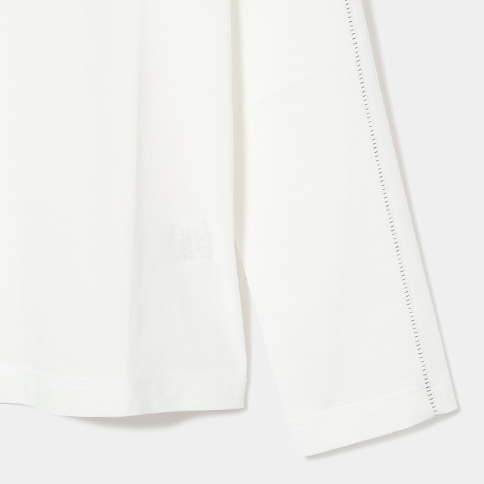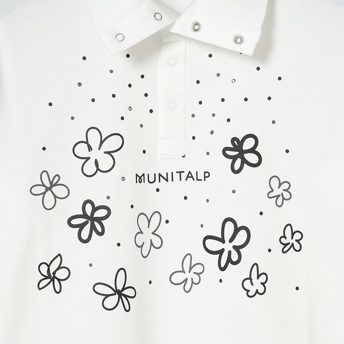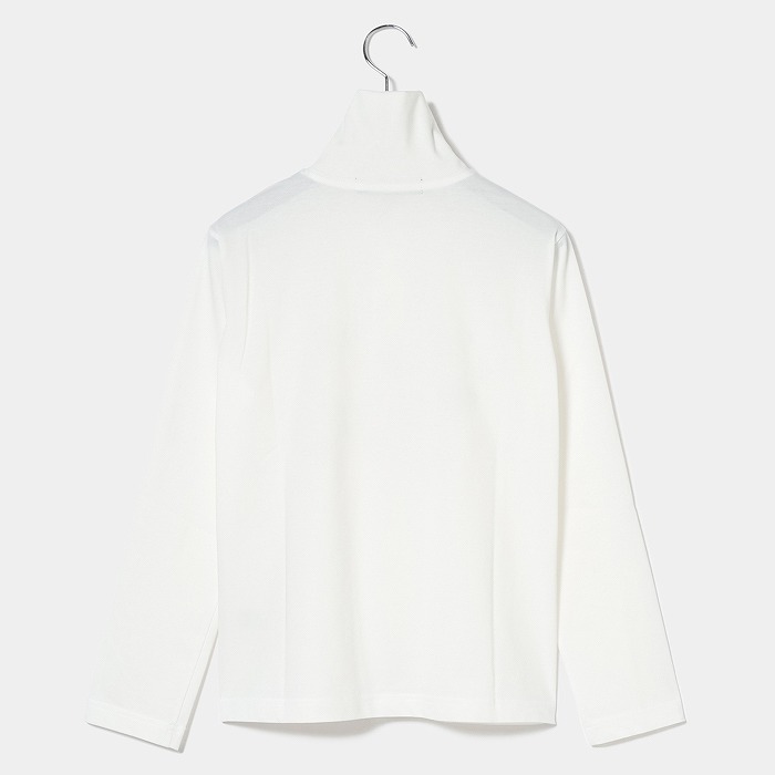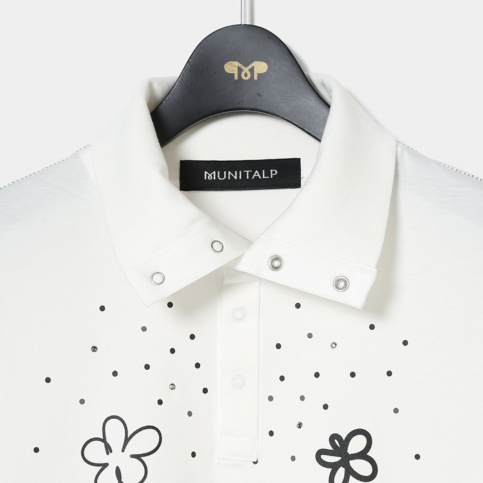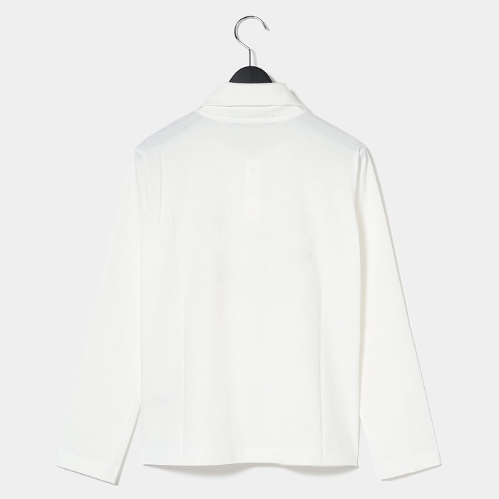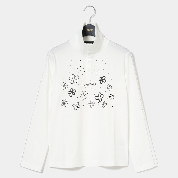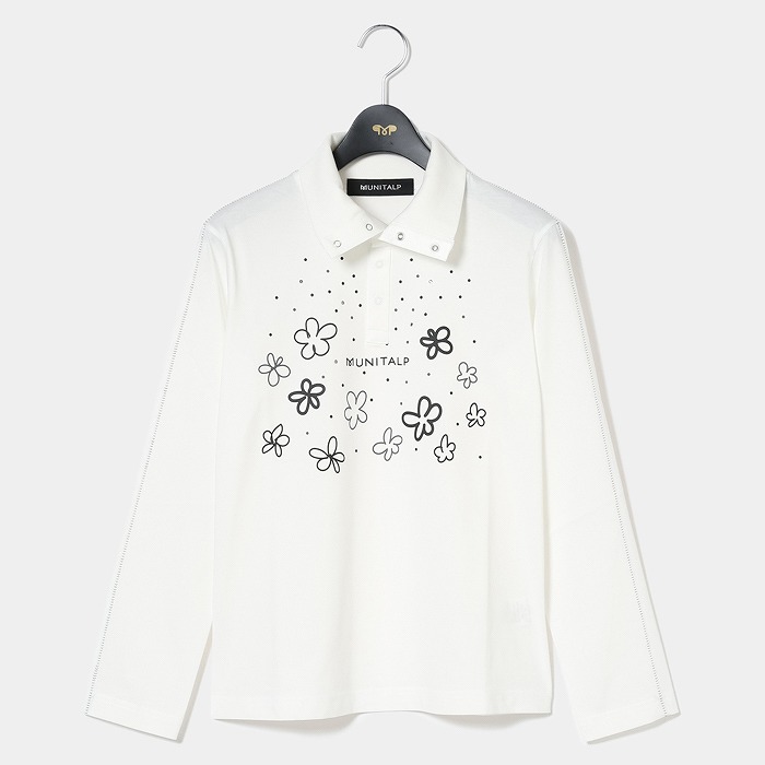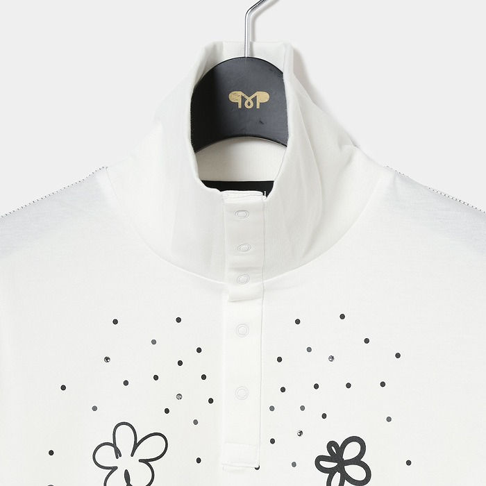 表に高品質な超長110/2サイロプレミアムを、裏にはPe加工糸を使用。サイロプレミアムは従来のカットソーに比べ洗濯後の毛羽立ちが少なく風合いを損ないにくい素材。裏にPe加工糸を使い、洗濯耐久性を高め綿100%にはないキックバックとさらっとした着心地感を追求。共糸フライスを使用した首元も着心地の良い仕様。寒い時は全部閉めて首を温かく、暑くなれば開けてウイングカラーで涼しく着用。春らしいポップな花柄をプリントし、朝露のような水滴をラインストーンで表現しています。