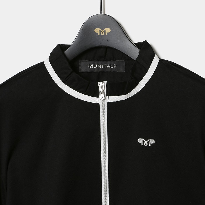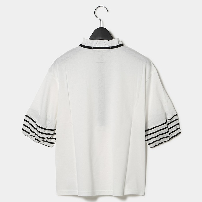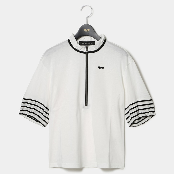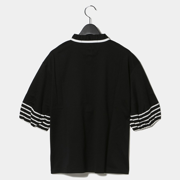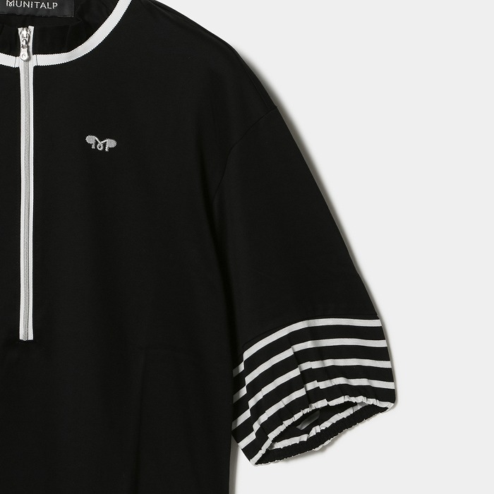 30回を超える繰り返しの洗濯後も風合いの変化を抑え膨らみ感や光沢感の低下を最小限に抑えたprimazymJERSEY。UVカットもついています。その素材を中心に使い、お袖端にはalbini organic jersey stripesを使い、袖口の中にゴムを入れ少しランタンスリーブのようにしました。ゴルフウエアなので、控えめなボリュームにしています。