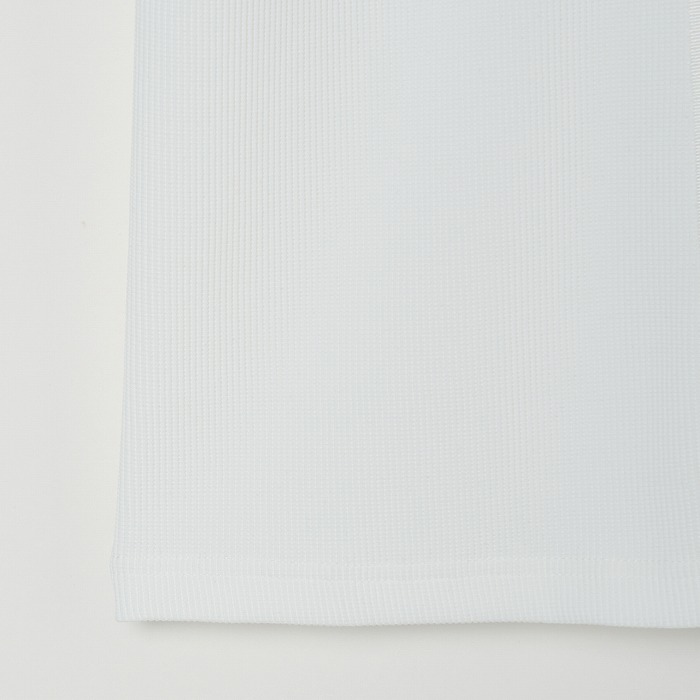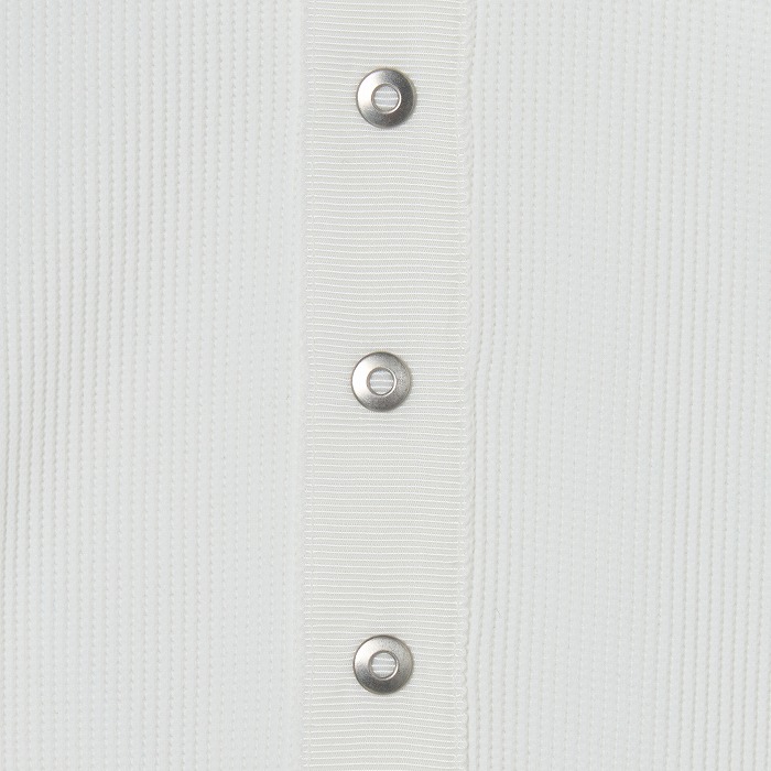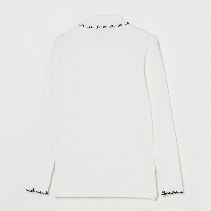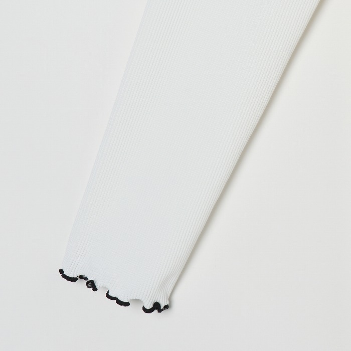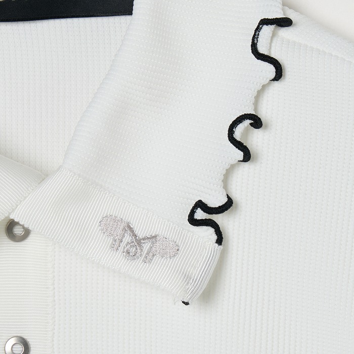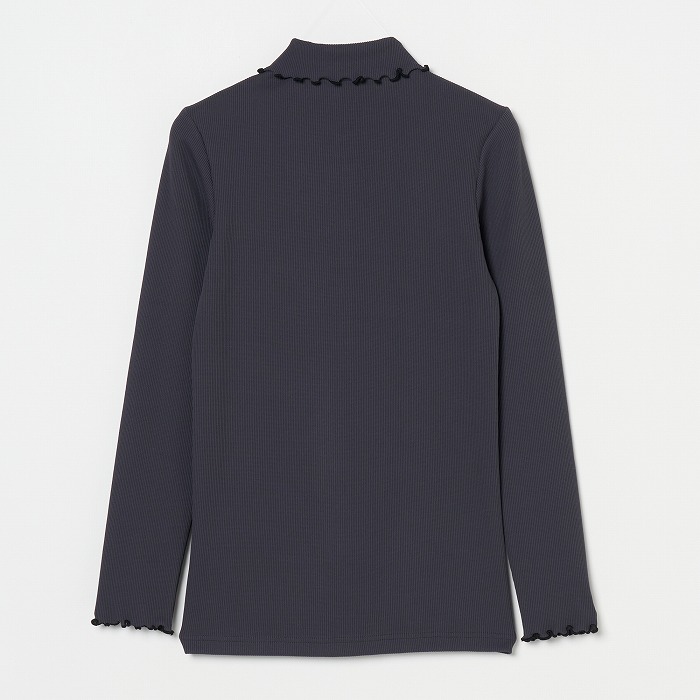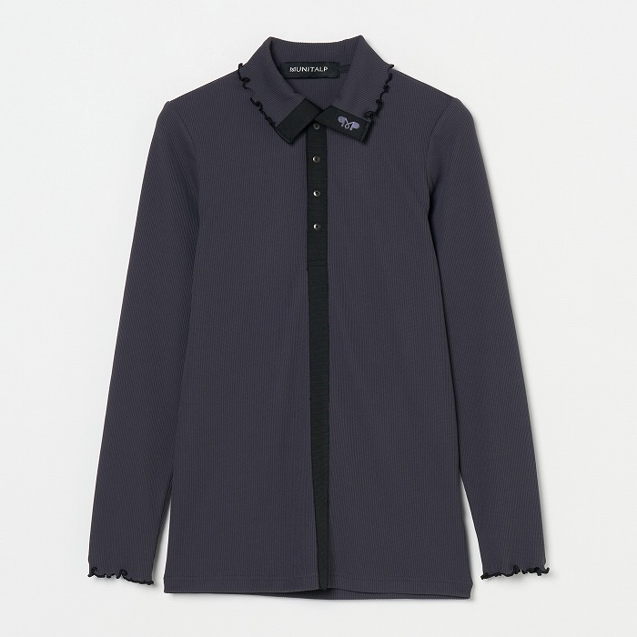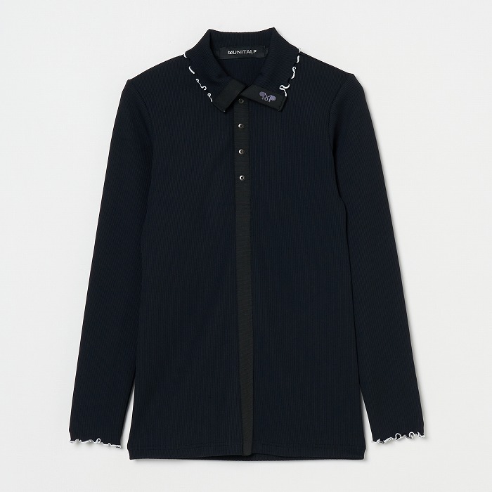 チューブ状になったポリエステルのリブジャージで長袖のポロを作りました。リブなのでのびのびで、サイズを選びません。どなたでもきれいに着ていただけます、そして脇シームがないことで、着心地がいいです。衿端には配色でメローミシンをかけてフリルにしています。前立てはグログランテープで締め、細く見えるようにしています。どなたでも着用できますが、身幅が大きすぎると、着丈が短くなるので、一度ご試着いただき、バランスを確認してお買い上げいただきたいです。