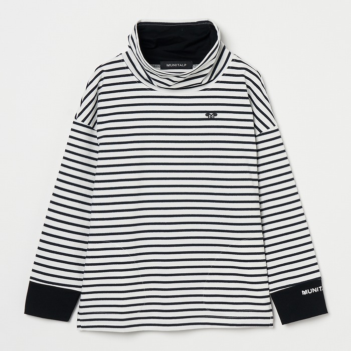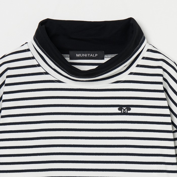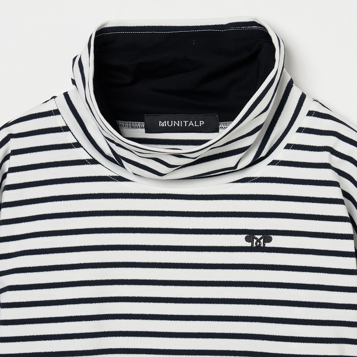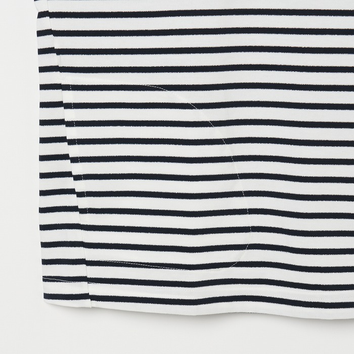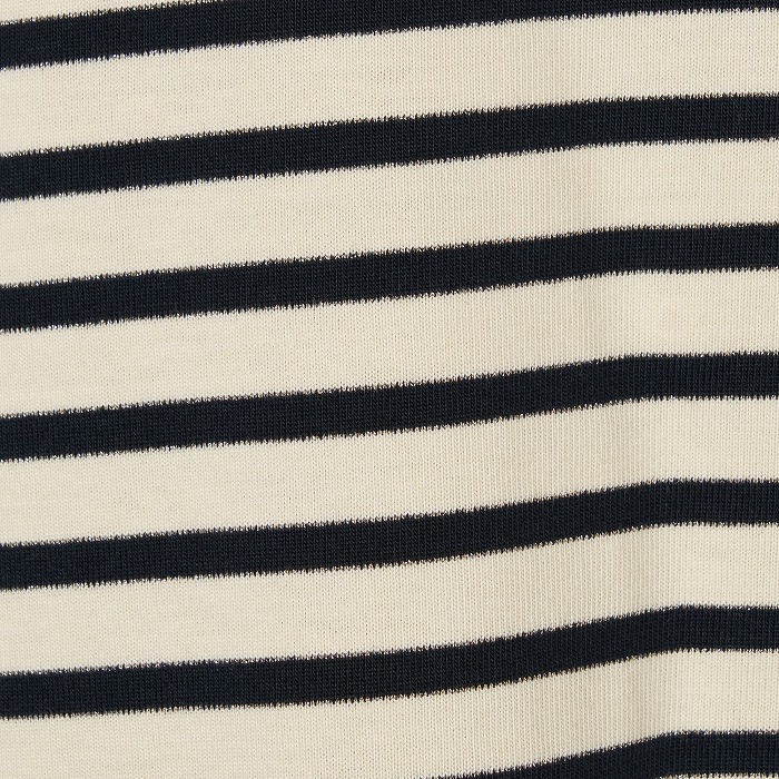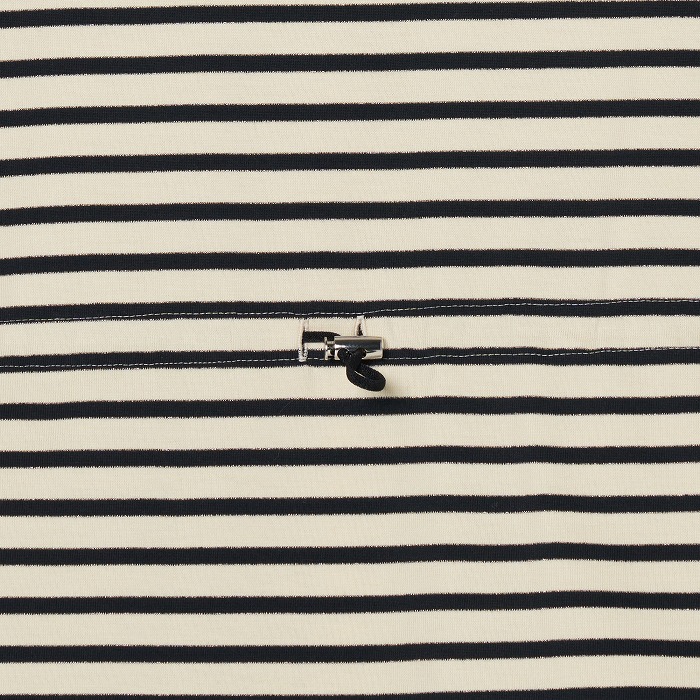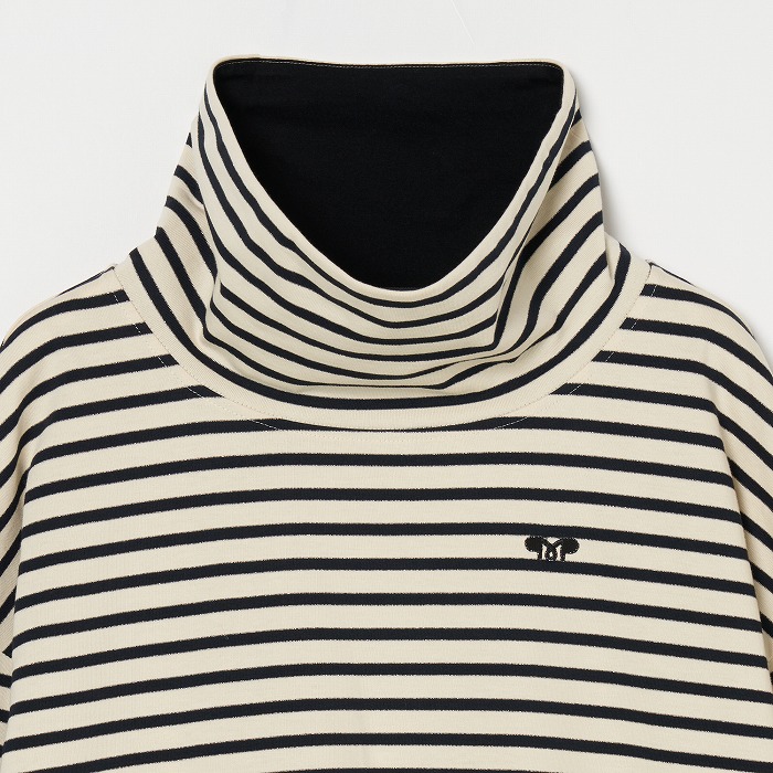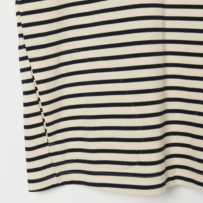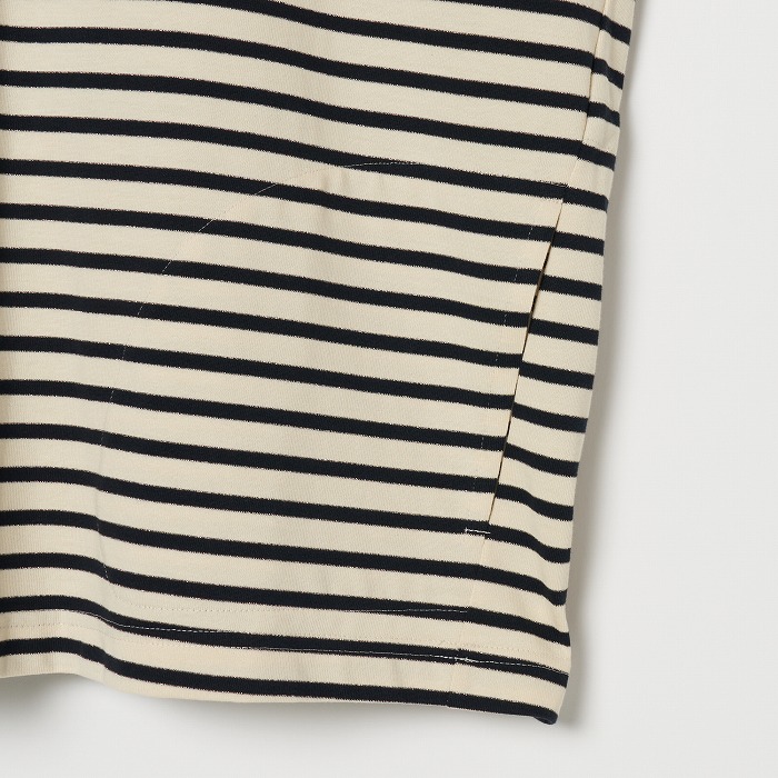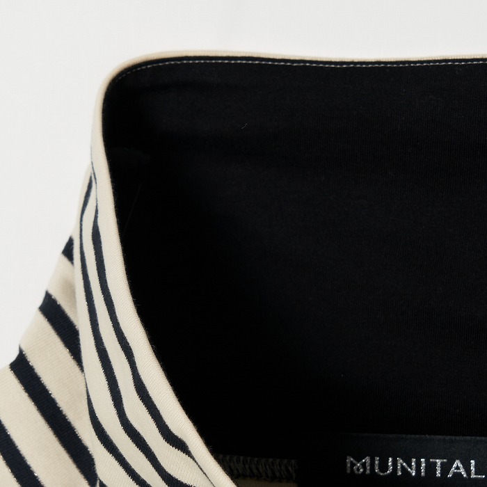 32/-の微強撚糸を引き揃えて編んだ天竺ボーダー。ラメが細ラインの上下に一段 入っていて ちらきらと上品に光ります。極限までにハイゲージで編んでるために目面がきれいですが、横伸びが多くないので そのために横幅が広いシルエットにしました。衿裏と袖口には接触冷感の綿素材を使っています。衿を折り返すと配色になります。