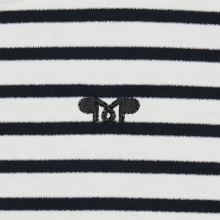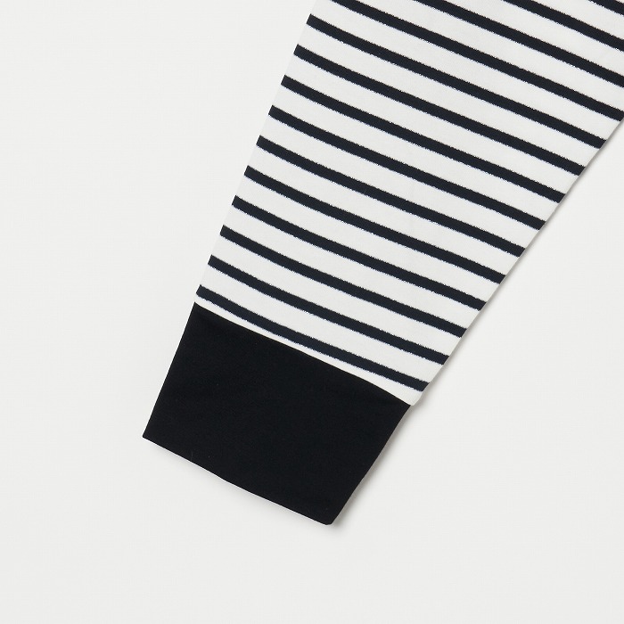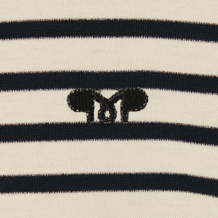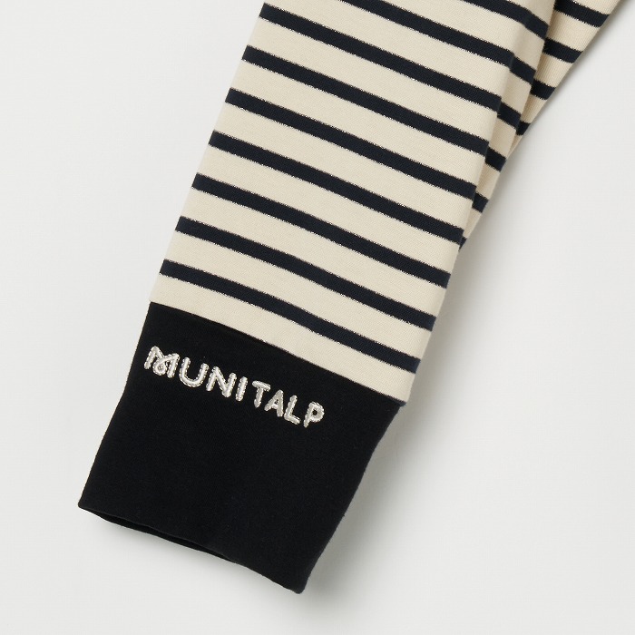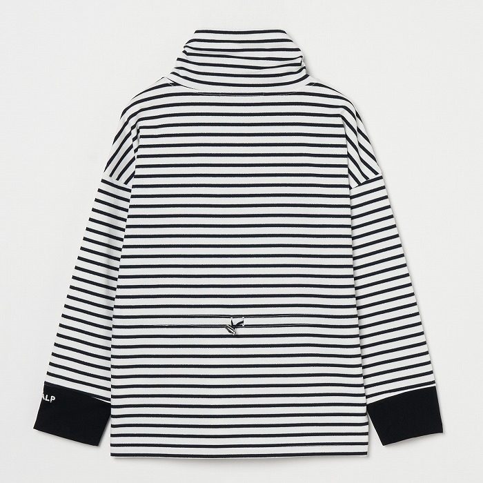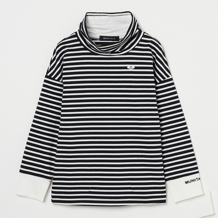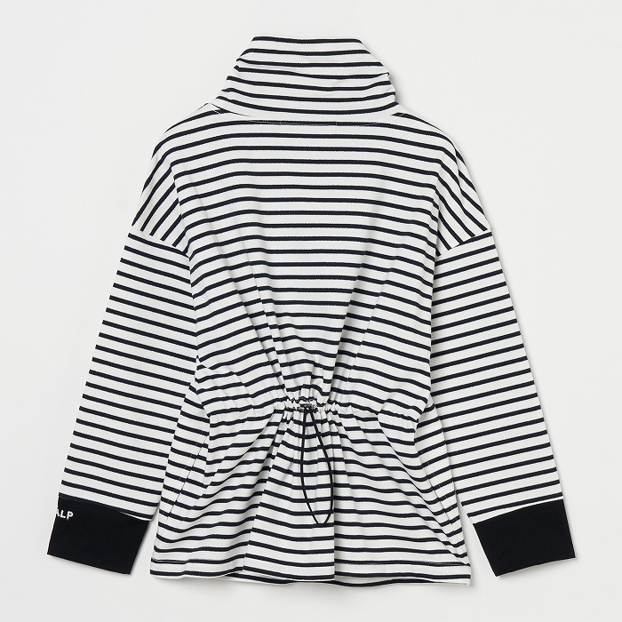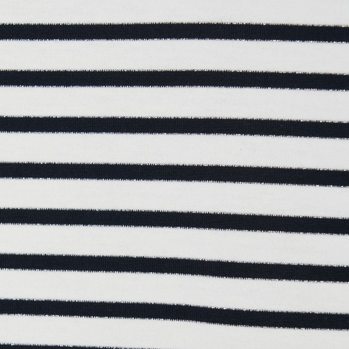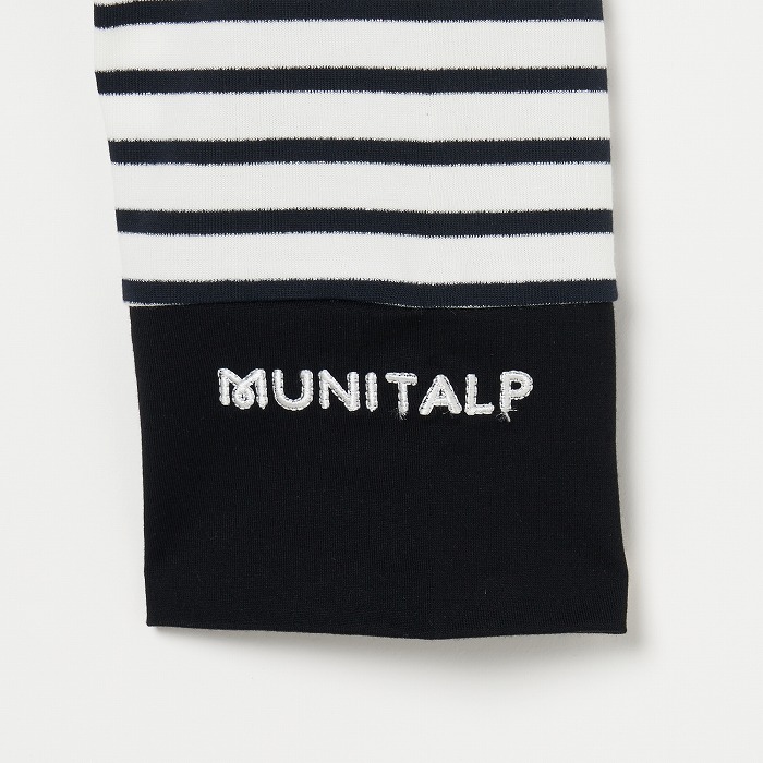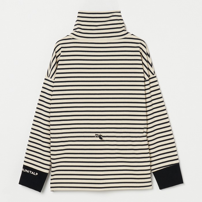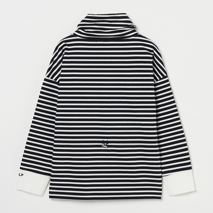 32/-の微強撚糸を引き揃えて編んだ天竺ボーダー。ラメが細ラインの上下に一段 入っていて ちらきらと上品に光ります。極限までにハイゲージで編んでるために目面がきれいですが、横伸びが多くないので そのために横幅が広いシルエットにしました。衿裏と袖口には接触冷感の綿素材を使っています。衿を折り返すと配色になります。