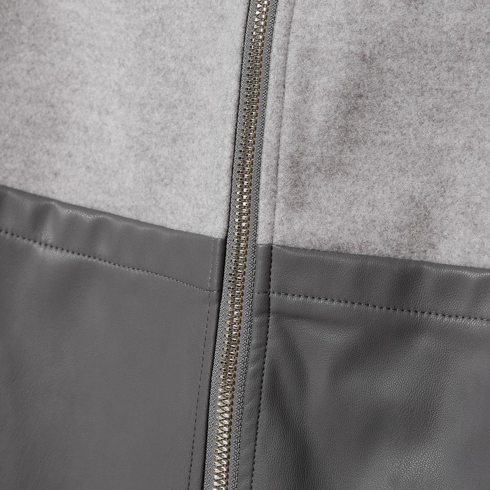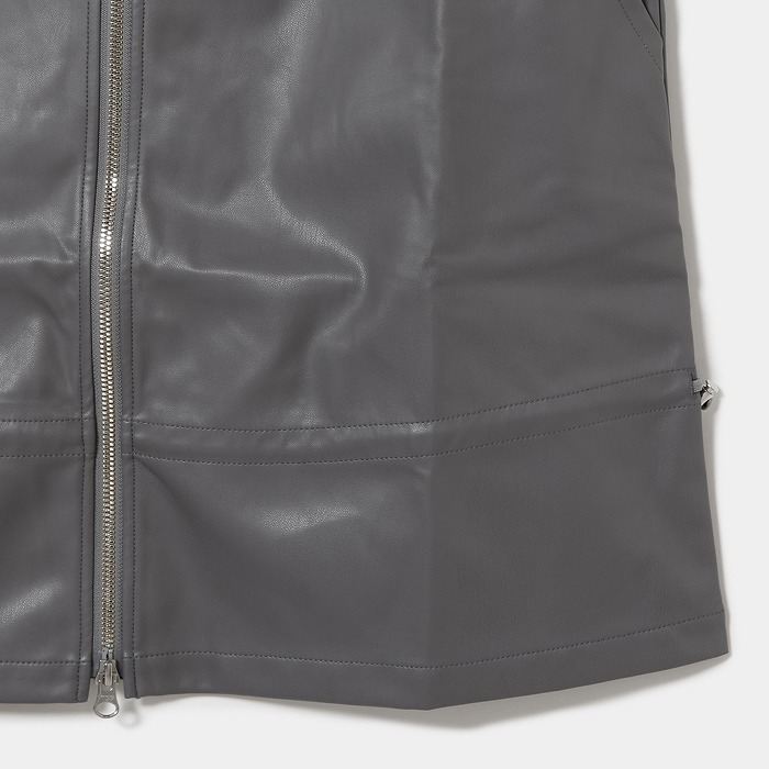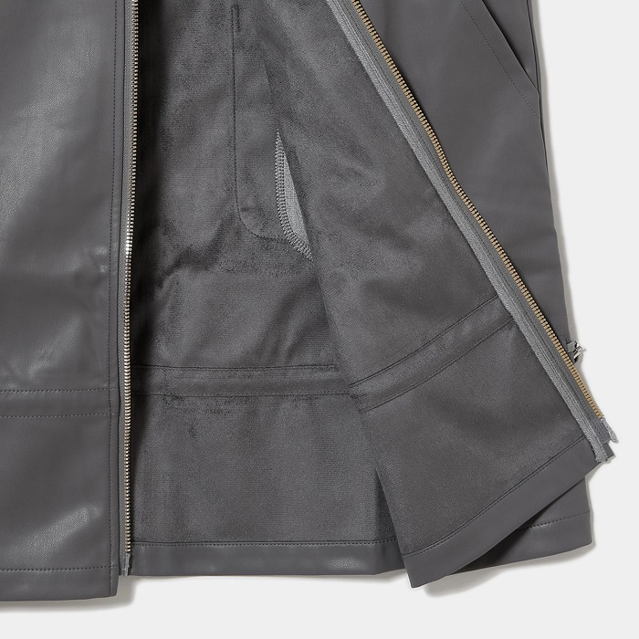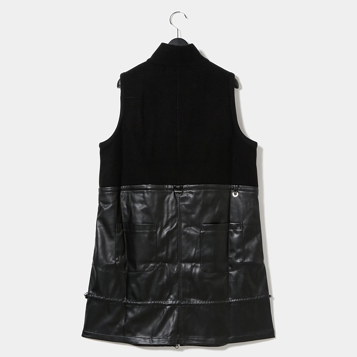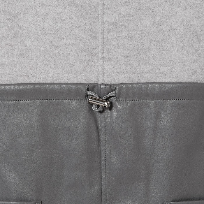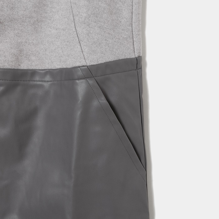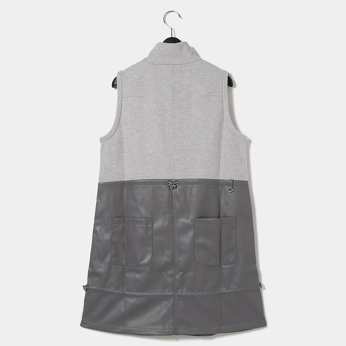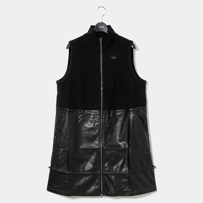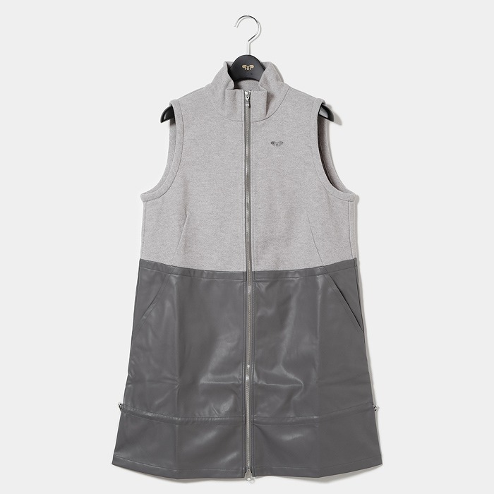 身頃はメルトン風のNEEDLE STRETCHジャージ。スカート部分は合皮裏起毛で、風を通さないジャンスカです。前明きなので、暑いときは脱いだり、ファスナーをポイントでとめて羽織るように着ていただくと、風通りもよく、便利なポケットもたくさんあってプレーにぴったり。ちょっと濡れてるところに、軽く腰を下ろしても 気になりません。裾のスピンドルをきゅっとしめていただくと、シルエットがバルーンになってキュートです。