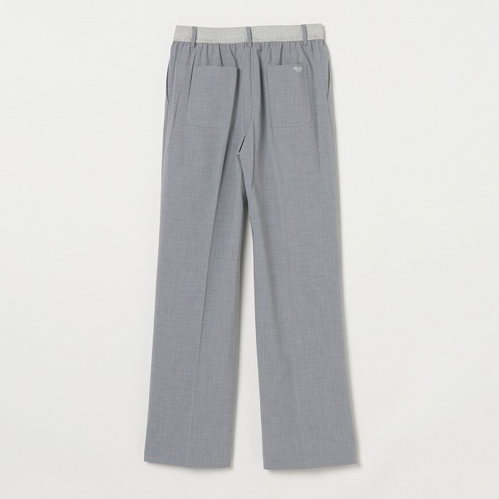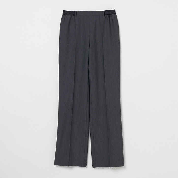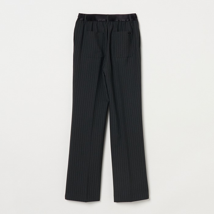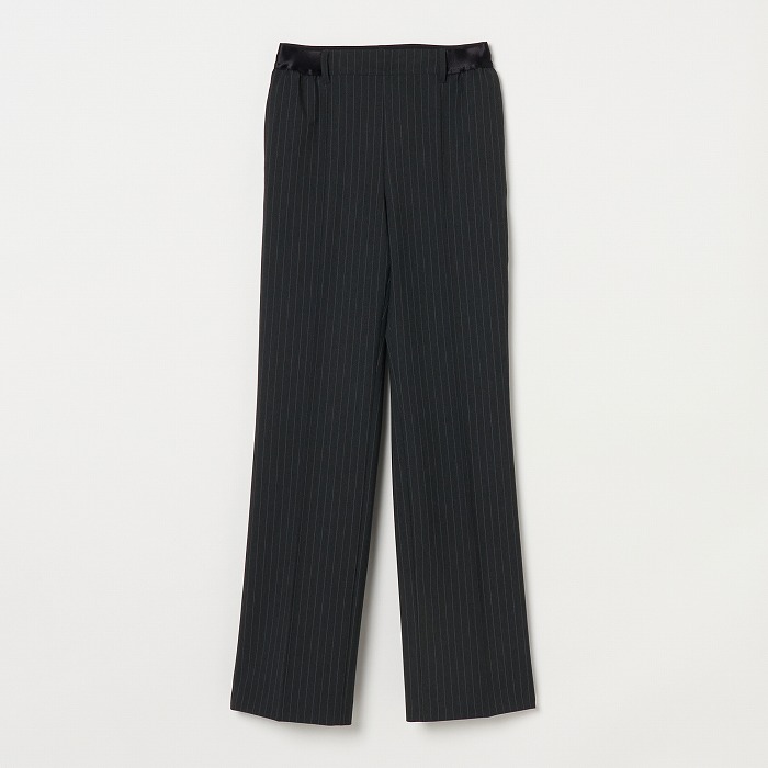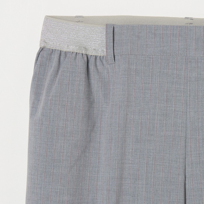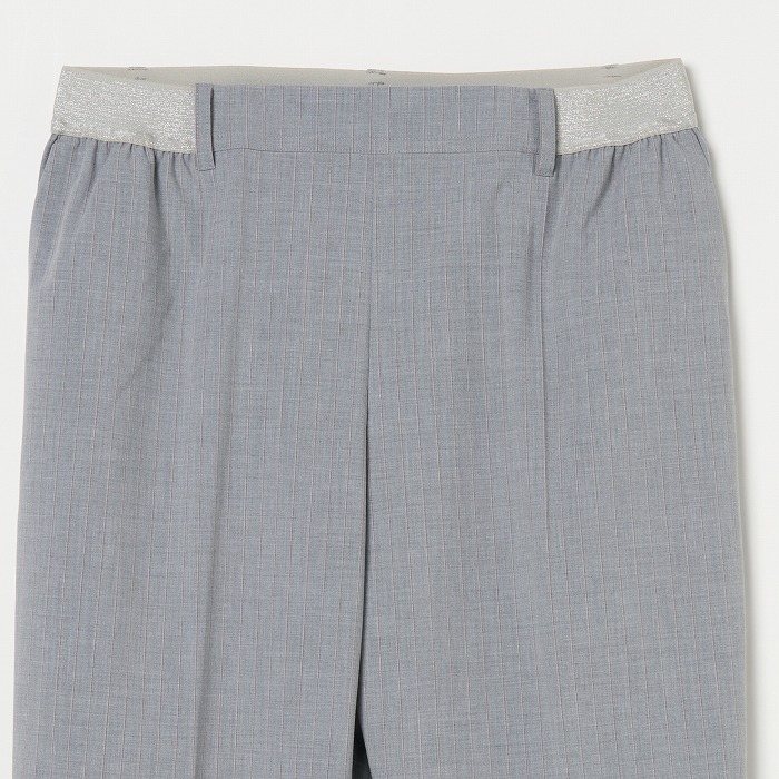 ポリエステル/レーヨン/ポリウレタン。少しストレッチのあるシーズンレスな素材を使用したストライプ柄 のワイドパンツ。脇から後ろにかけてウエストゴム仕様にしています。