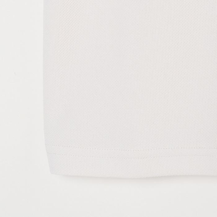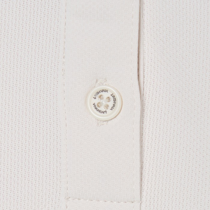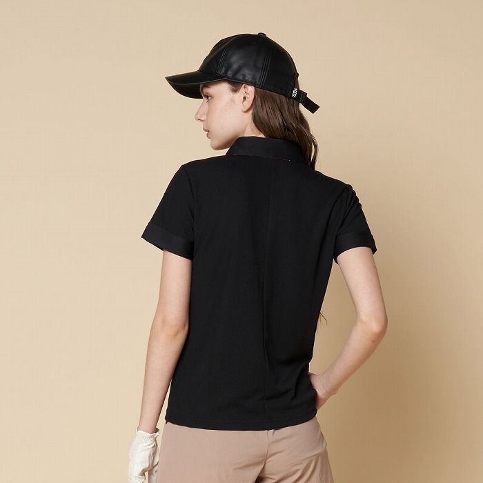 上品でガーリーな印象のハートドット総柄を衿裏に配した半袖ポロ。衿を下せば無地見えする着回し抜群のアイテムです。衿裏柄と同配色のダイヤゴナルのボトムスとの合わせもおすすめです。袖口の切替は二の腕をカバーし、ウエストシェイプデザインなのでさり気ないスタイルアップを叶えます。バックスムースの細かな鹿の子素材で、暑さの残る秋のゴルフにぴったりな吸水速乾素材。