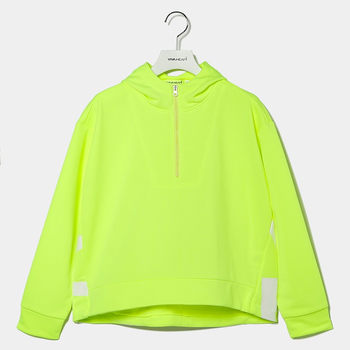 TOPS:42/ BOTTOMS:42バックプリントで後ろからの視線釘付けバックロゴが可愛いパーカーは、気温調整しやすいハーフジップタイプ。フードは小さめなので、プレーの邪魔をしません!小さなVIVA HEARTのロゴもポイント◎ ネオンイエローのパンツは、定番ショーツより少し股丈が長く、裾が広くなったキュロットシルエット。プレーしやすく、足が綺麗に見えるデザインです◎使用アイテム西 智子20代プロゴルファー