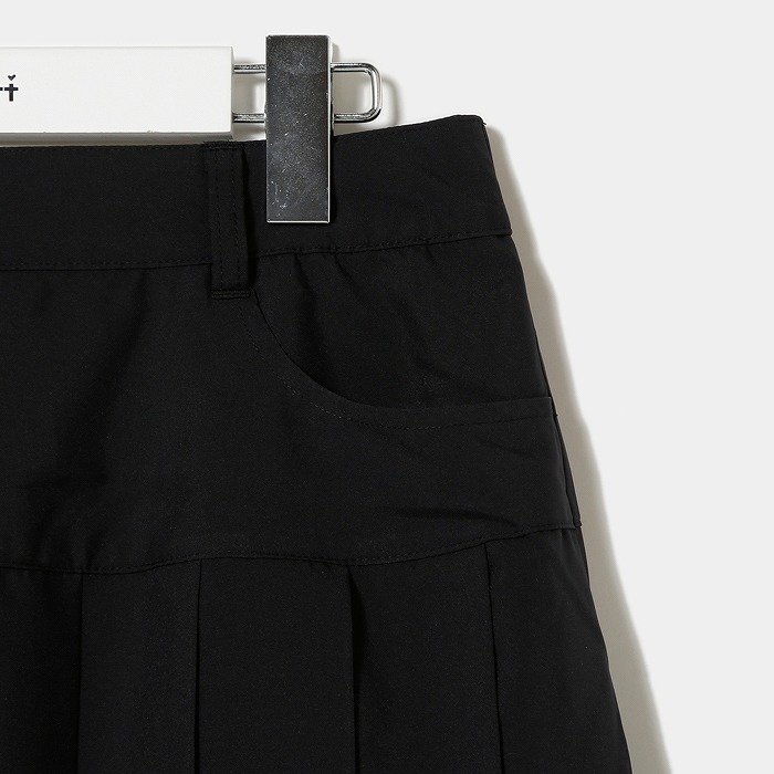 撥水素材のタフタ素材を使用した、プリーツスカート。デザインはヨーク切り替えにしてバックポケットの仕様を作っているので、ゴルフに適したデザインになってます。スタイリングしやすい無地のデザインアイテムなので、ジャガード柄のニットやデザイントップスなどスタイリングがしやすいアイテムです。